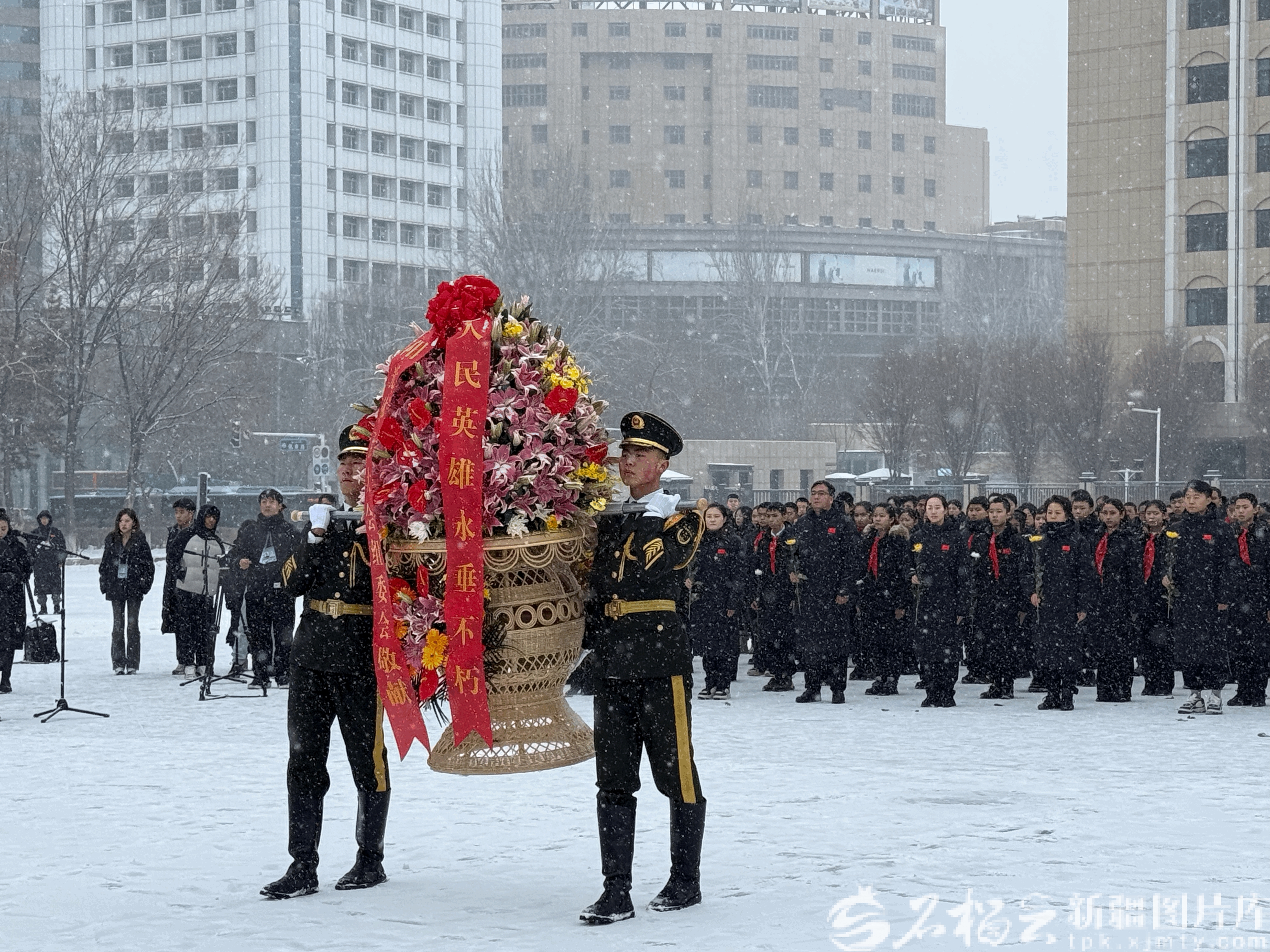 几百名青少年沐雪而立缅怀先烈——中国人民解放军进军新疆纪念碑前献花活动侧记