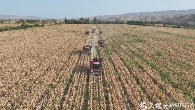 2025年9月底,玛纳斯县包家店镇的制种玉米地里,农机来回穿梭收割玉米,一派丰收的繁忙景象。玛纳斯县融媒体中心供图(资料图)