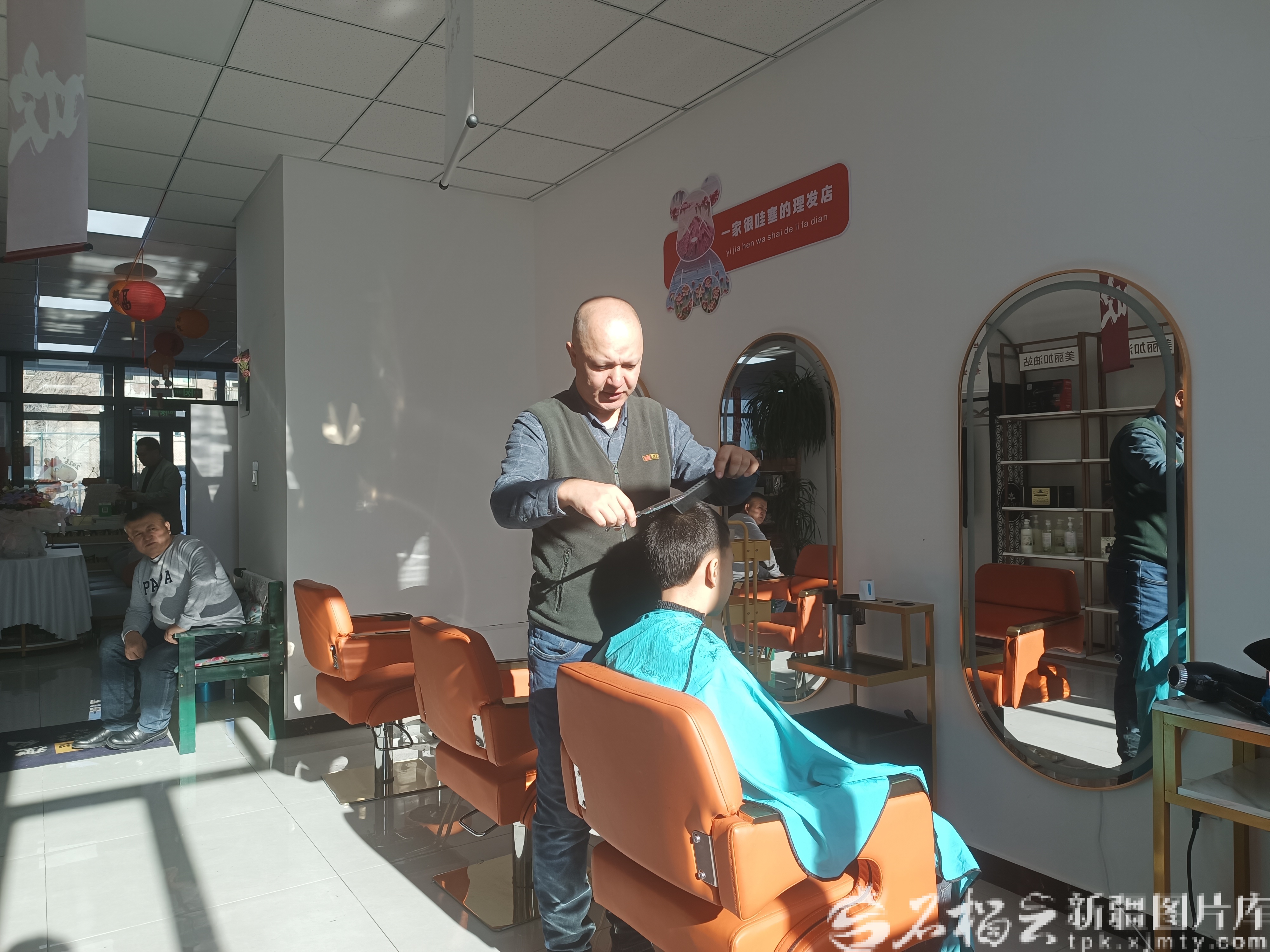 理发区里,退役军人艾尼瓦尔江正忙着剪发。作为社区志愿者,他每周定期到场,“老人、小孩剪发只要8元,大人10到15元,大家不用跑远路,在家门口就能剪好头发。”