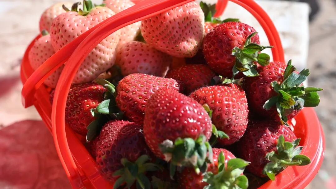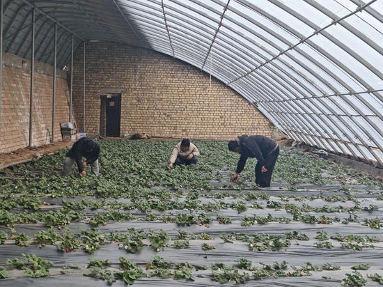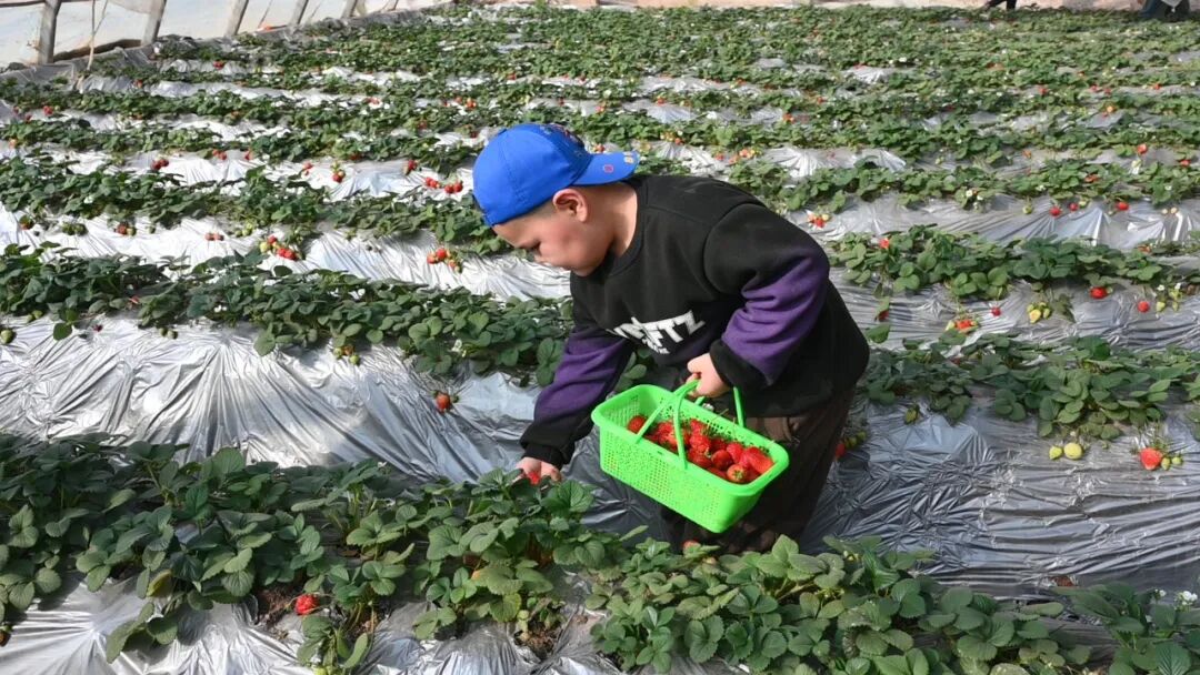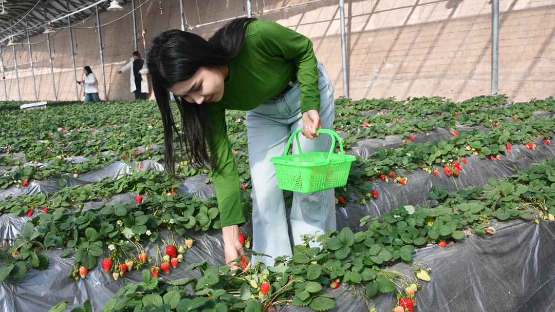 △春节期间,在巴楚县阿纳库勒乡墩买里村草莓采摘大棚内,呈现出一派生机勃勃、喜人热闹的景象。放眼看去,浓绿的枝叶间,鲜红的草莓点缀其中,个头饱满,不少游客手提果篮,穿梭在草莓植株间精心挑选。