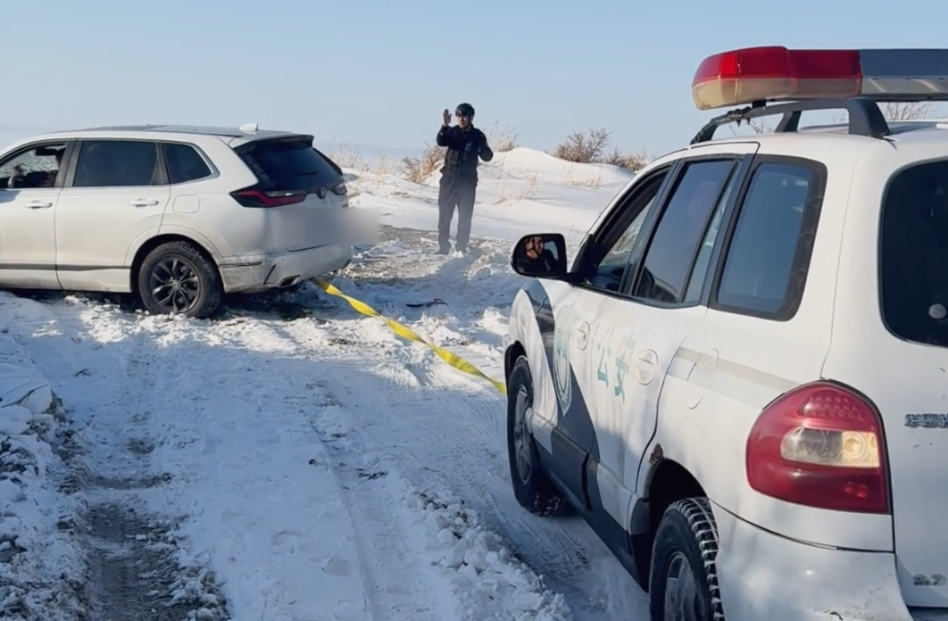 同日,3名自驾游客前往乌伦古湖欣赏冬日湖景,为拍摄雪景照片,他们驾车偏离正规道路,驶入湖边禁行区域。该区域地表被薄雪覆盖,下方是松软沙地与冻融土层,车辆驶入后瞬间打滑陷车,游客多次自救无果,反而让车身越陷越深。