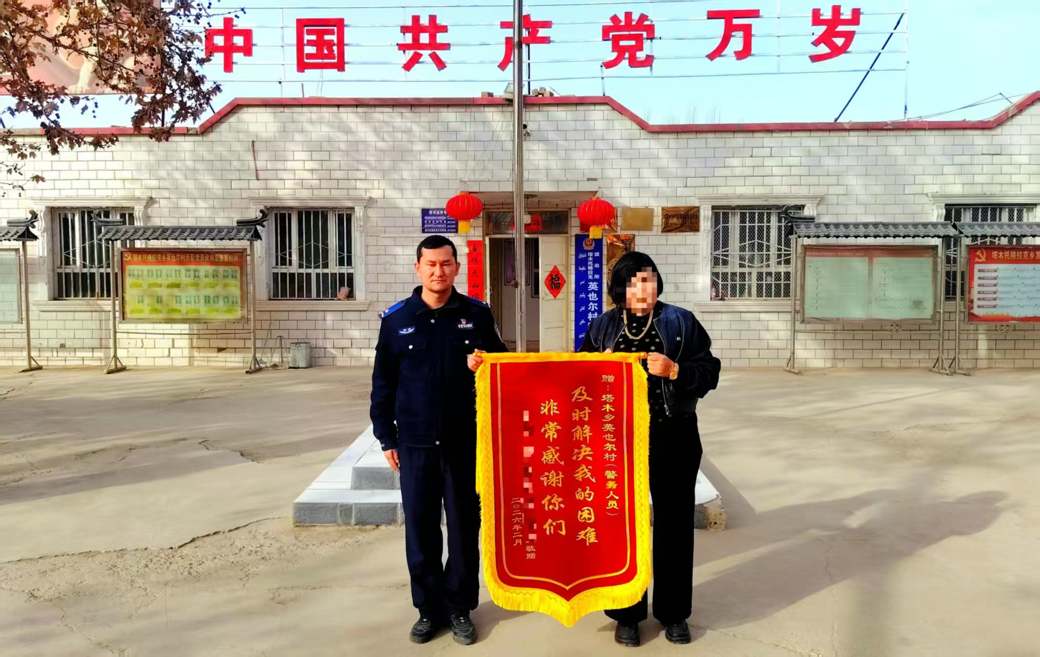 2月20日,在新和县公安局塔木托格拉克乡派出所英也尔村警务室,阿女士将一面锦旗送到辅警阿卜杜热合曼手中。通讯员 麦麦提·萨木萨克摄