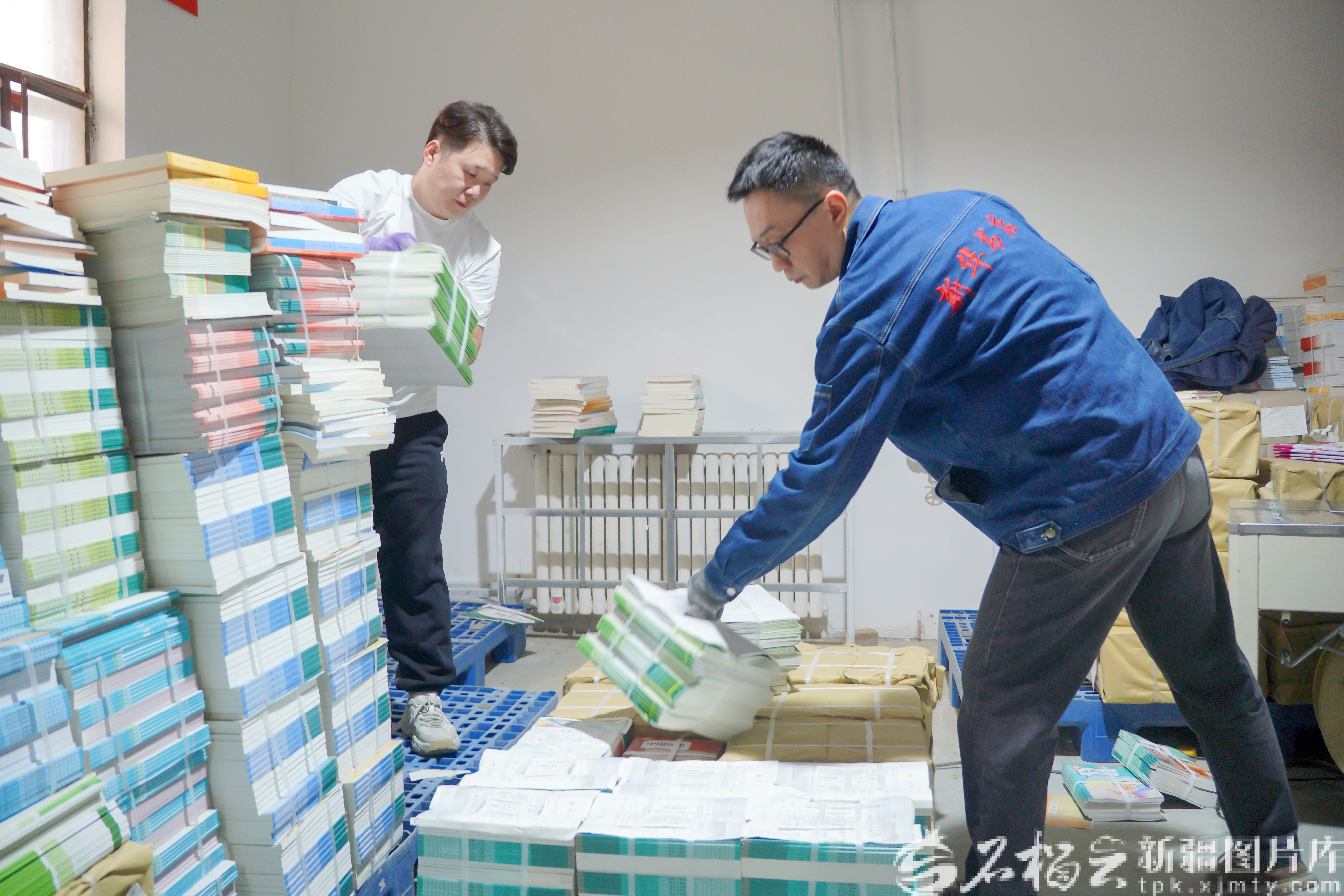2月24日,昌吉新华书店配送中心,工作人员在分发新教材。杨斌摄