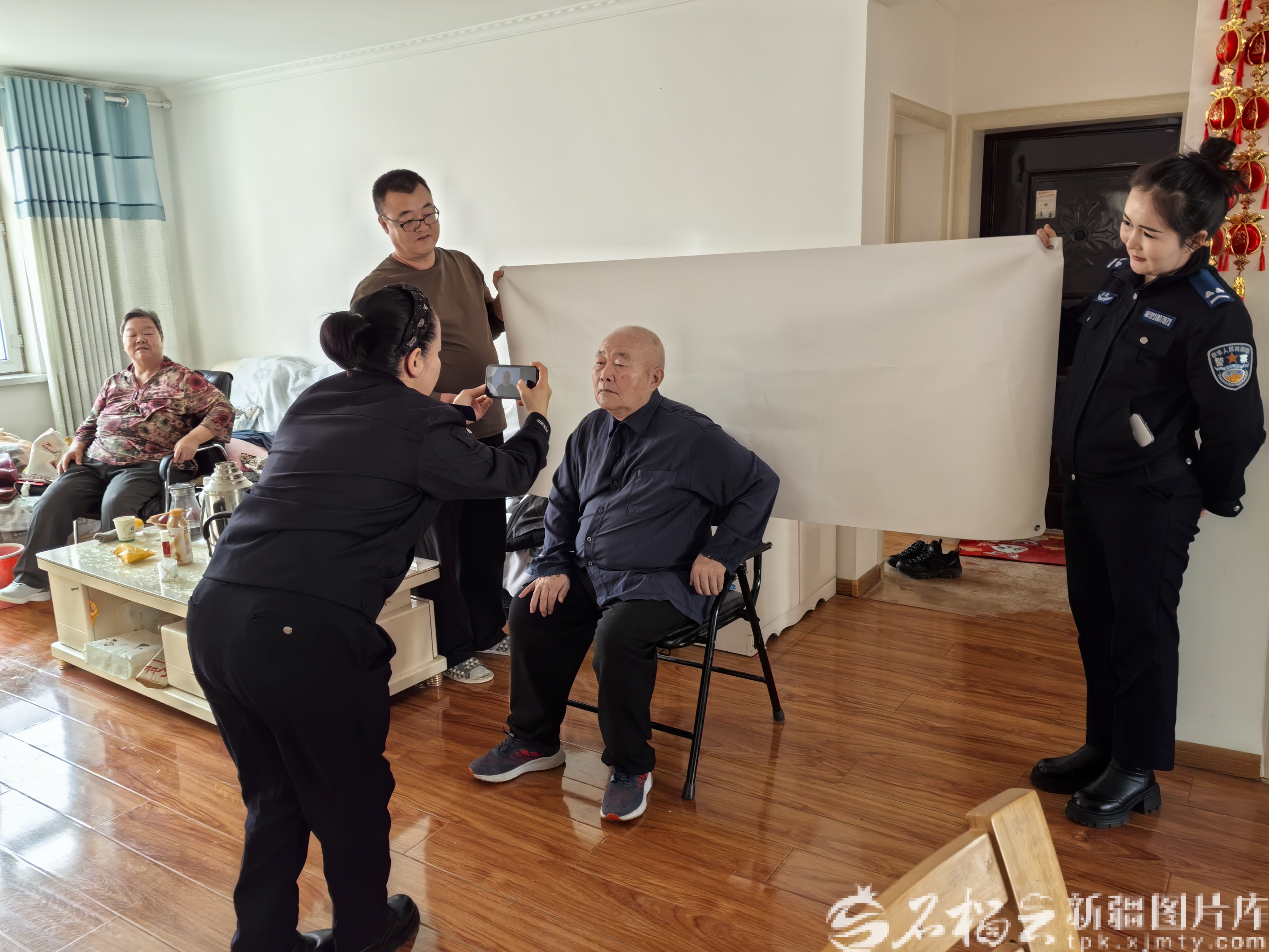 春节期间,和布克赛尔蒙古自治县公安局针对特殊群体需求,把户籍窗口从大厅延伸到院落、送到家里。2月18日,居民贾先生咨询:83岁的父亲行动不便,身份证丢失了咋办?县公安局和布克赛尔镇派出所户籍窗口民警辅警立即上门服务,为老人拍摄身份证照片。