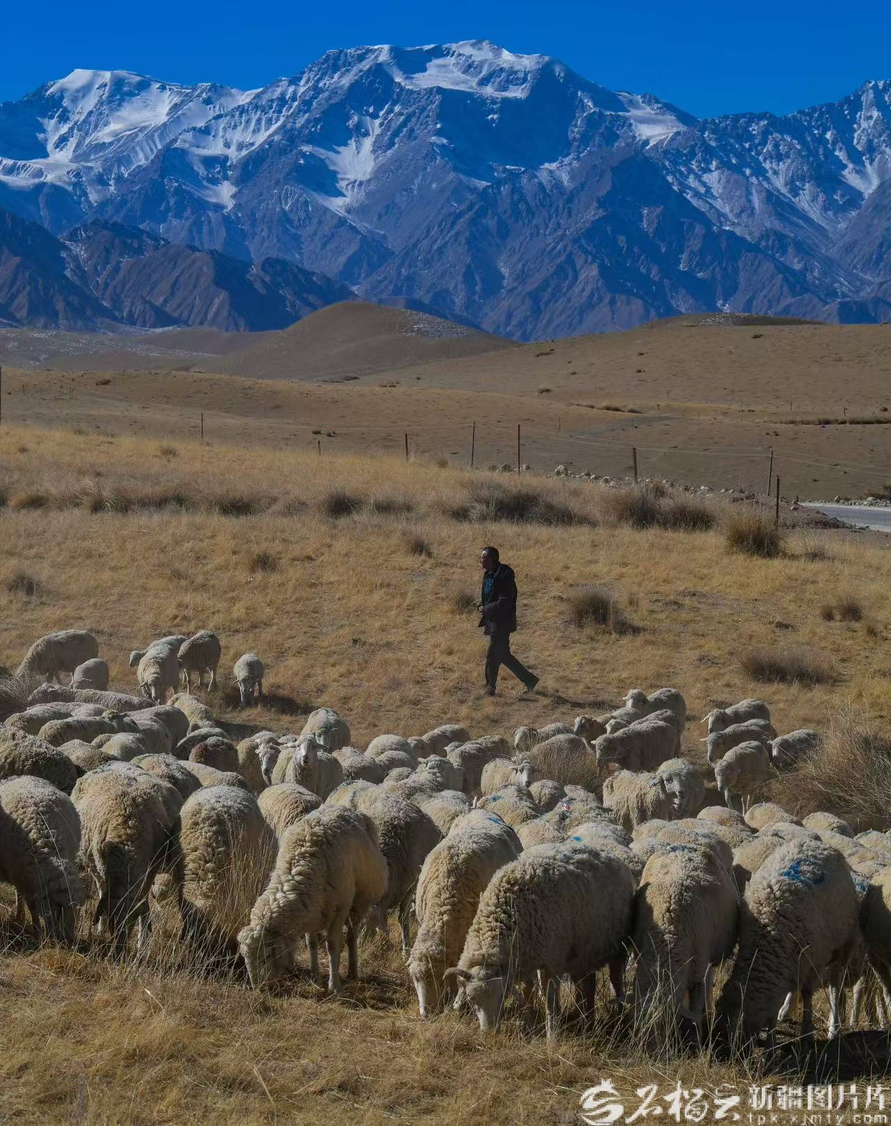 昆仑山脚下,策勒县奴尔乡其曼巴格村牧民伊敏托乎提·麦提图尔荪在放羊。石榴云/新疆日报记者 拍热扎提·阿不都摄