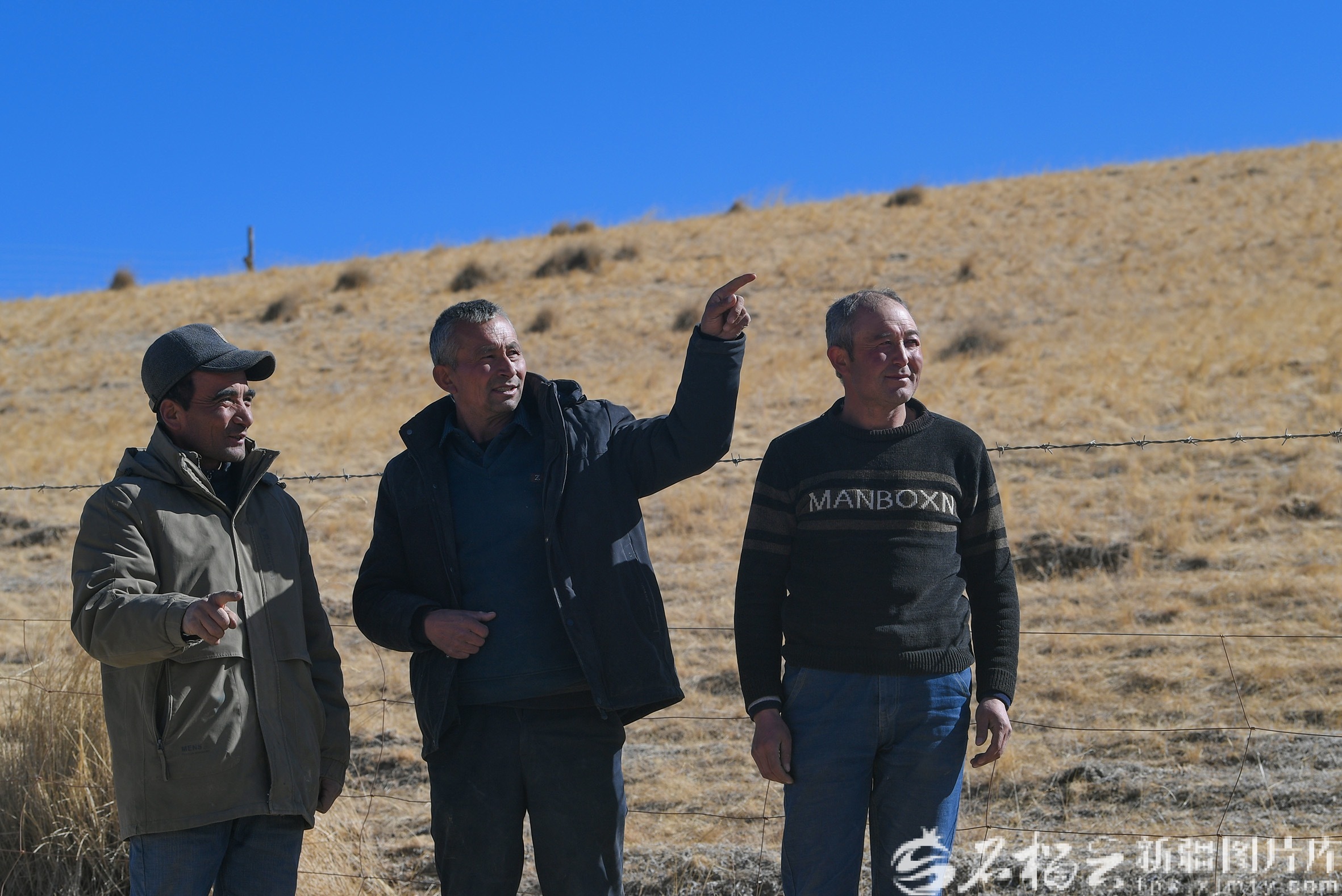 伊敏托乎提·麦提图尔荪(中)碰到一起在冬草场放牧的牧民。石榴云/新疆日报记者 拍热扎提·阿不都摄