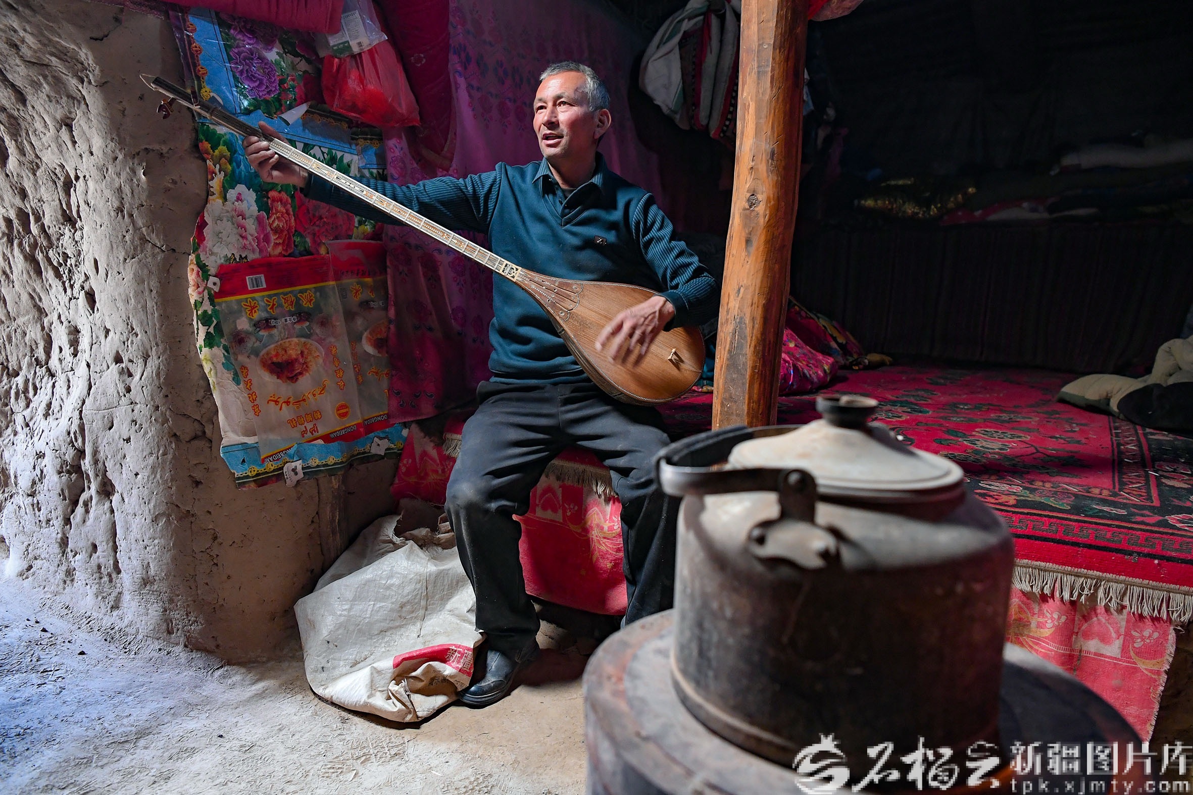 伊敏托乎提·麦提图尔荪在地窝子里弹都塔尔。石榴云/新疆日报记者 拍热扎提·阿不都摄