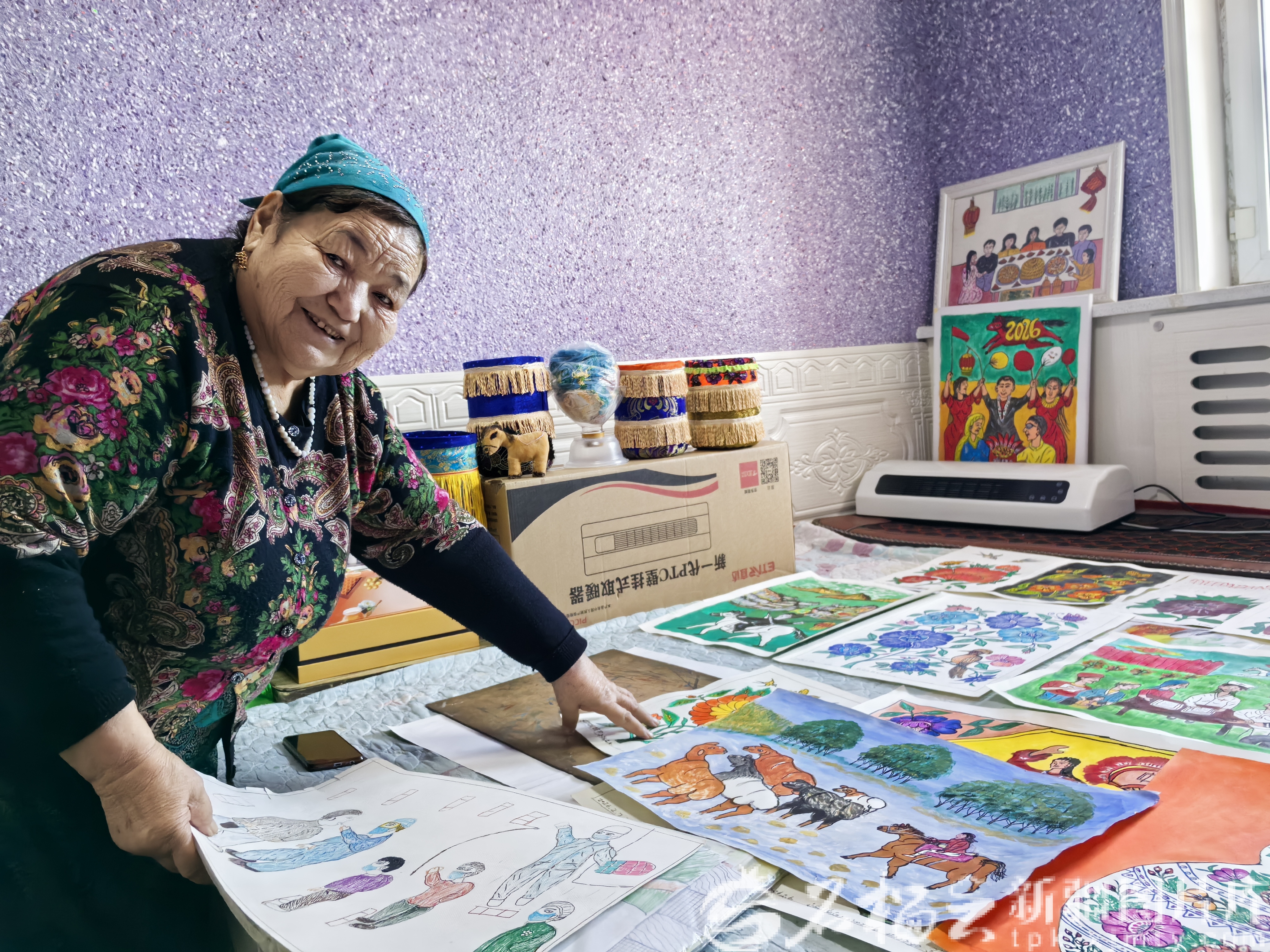2月23日,下马崖乡年逾古稀的农民画家茹则瓦妮罕・库尔班展示最近的作品。天山网-新疆日报记者魏永贵摄