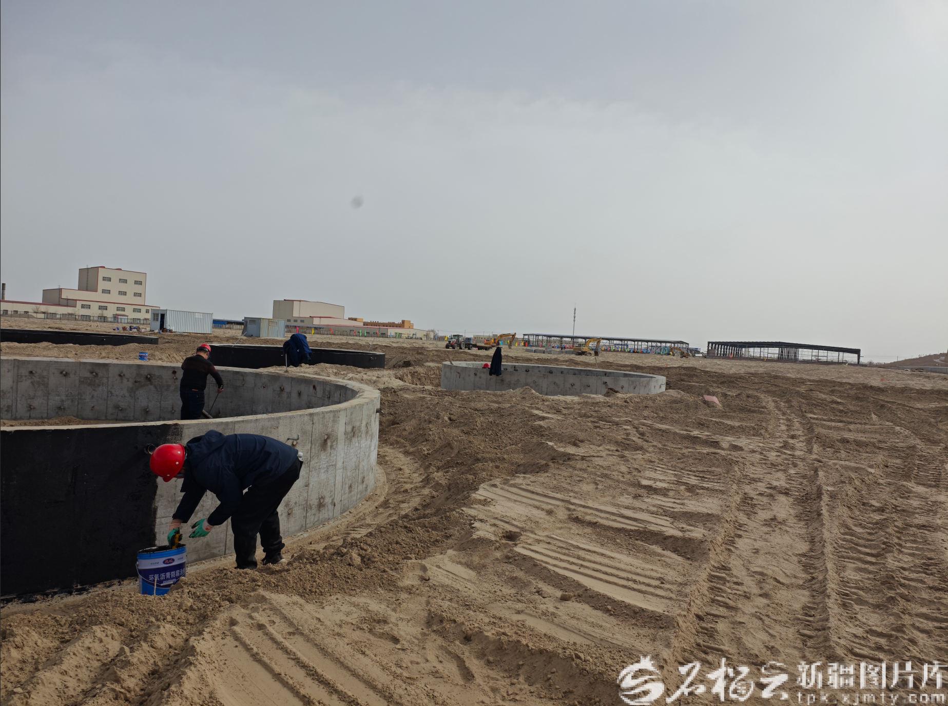 3月2日,尉犁县新疆鸿泰鼎绿色新材料纺织产业园项目建设现场,工人们对混凝土构筑物进行防腐防水处理。阿布拉·吾买尔 摄