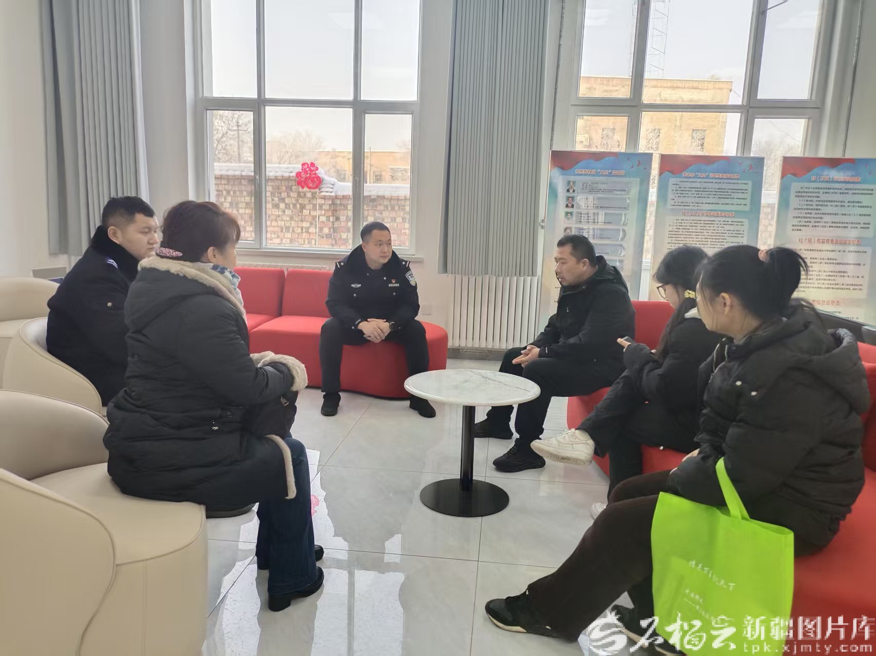 2025年4月,在奎屯市乌鲁木齐东路街道东绣苑社区活动室,社区警务室民警和社区干部正在调解居民矛盾纠纷。侯冰杨摄