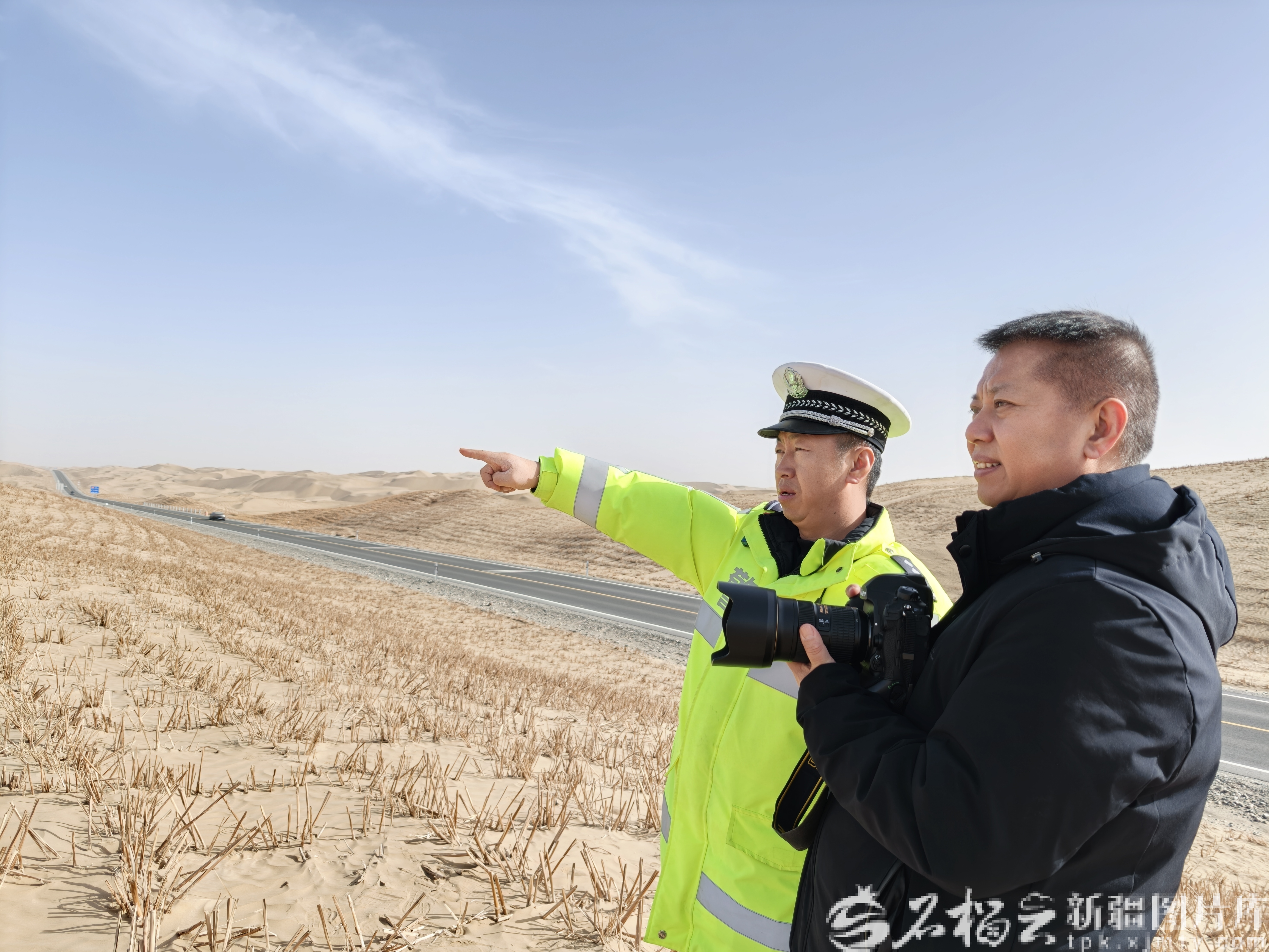 2月2日,石榴云/新疆日报记者杜建辉(右)在穿越塔克拉玛干沙漠的尉且沙漠公路开展采访。薛云少摄
