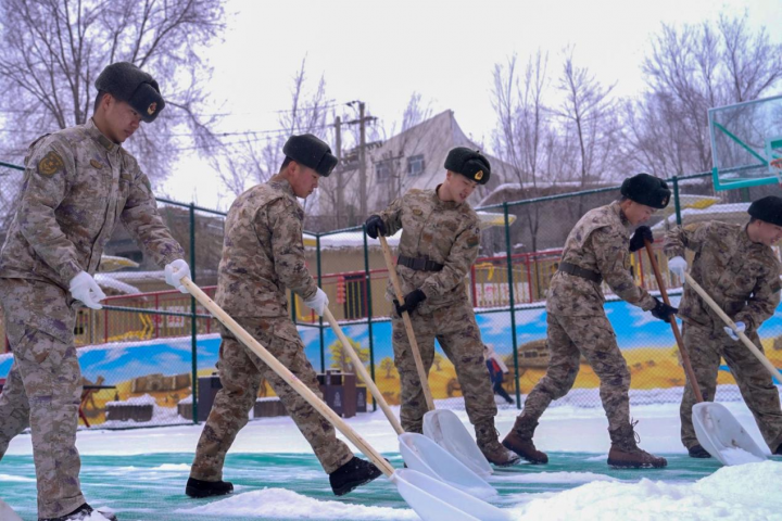 红军连队官兵在社区清理积雪