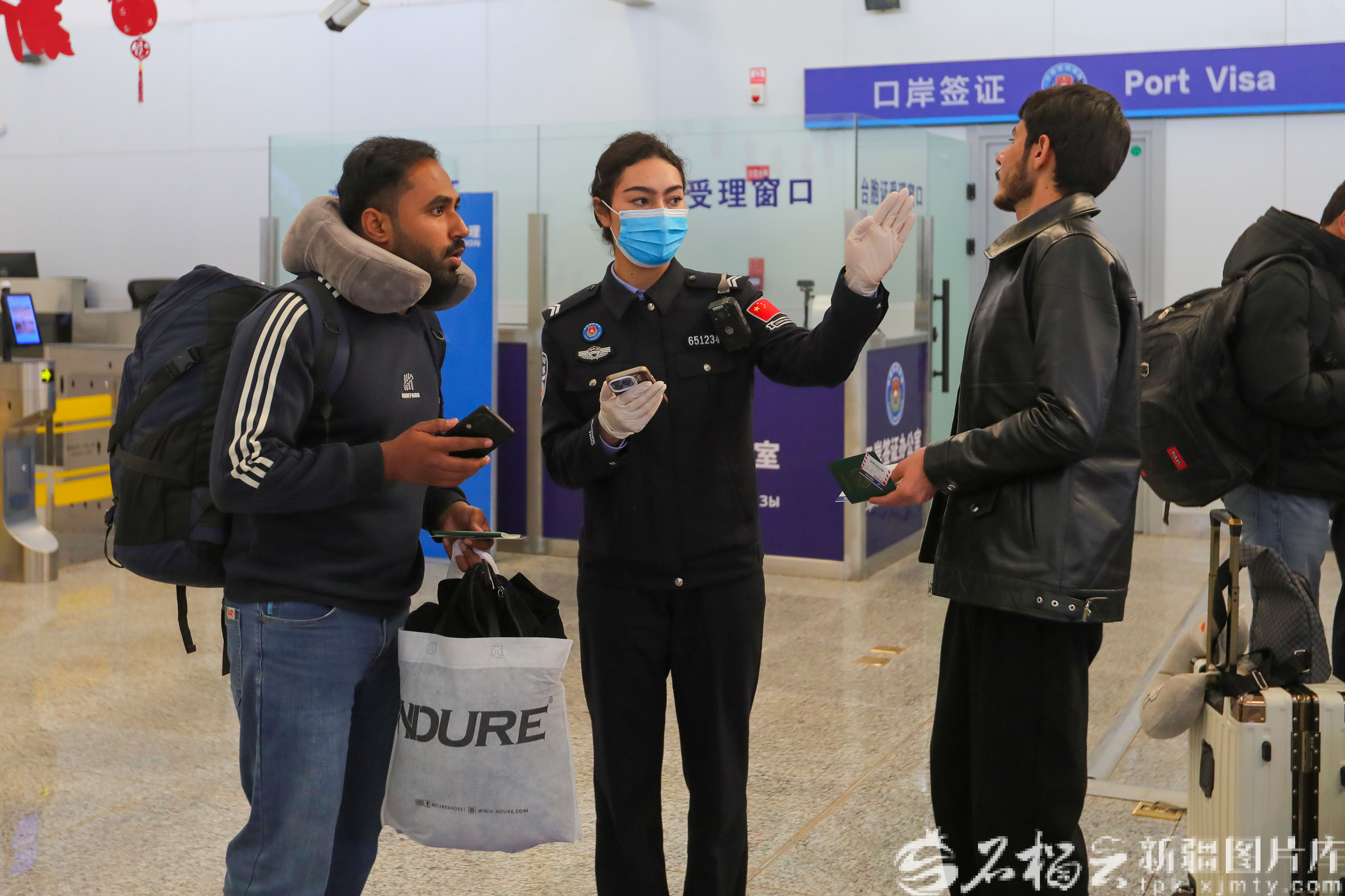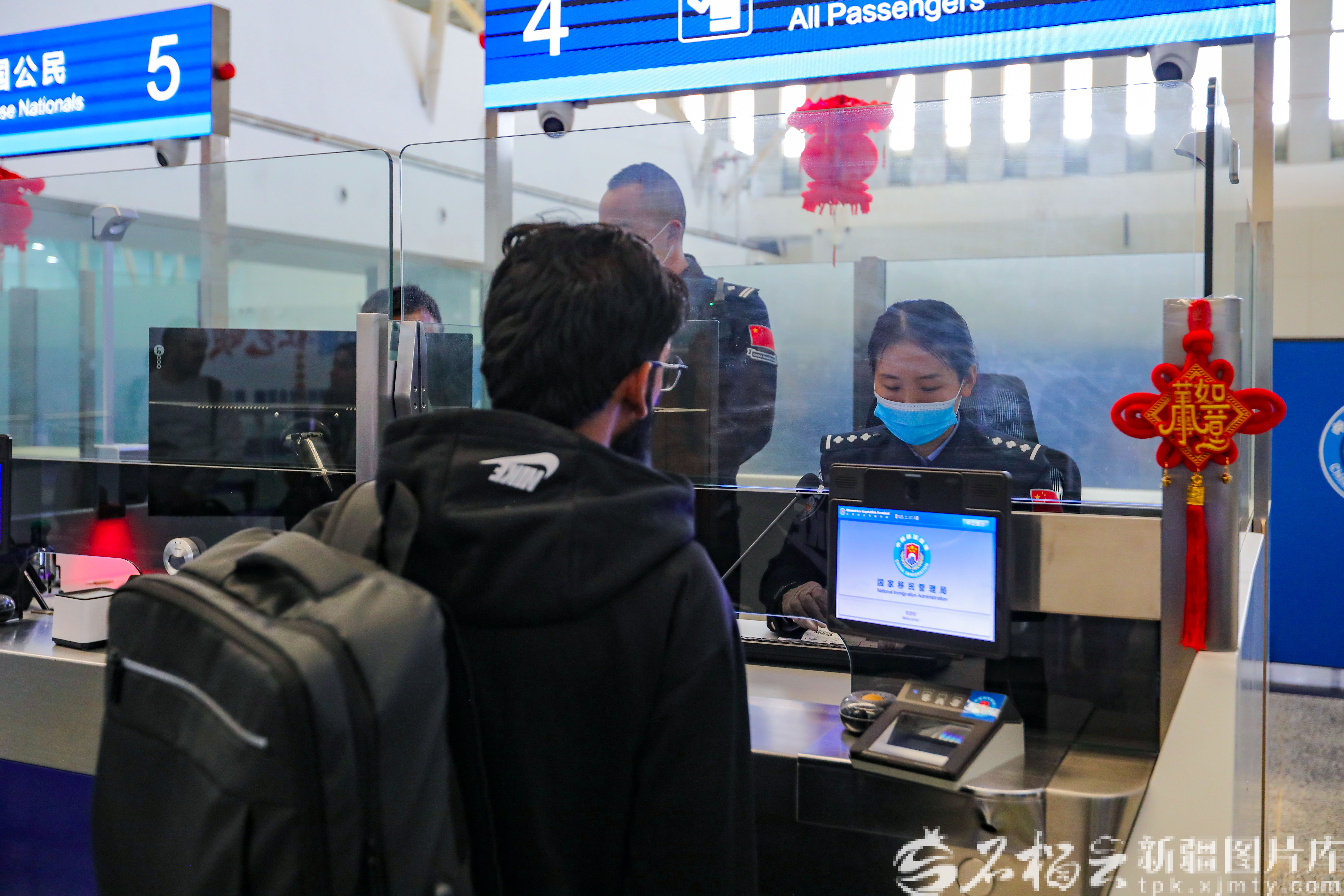 喀什出入境边防检查站民警为外籍留学生办理入境手续。王楚航摄