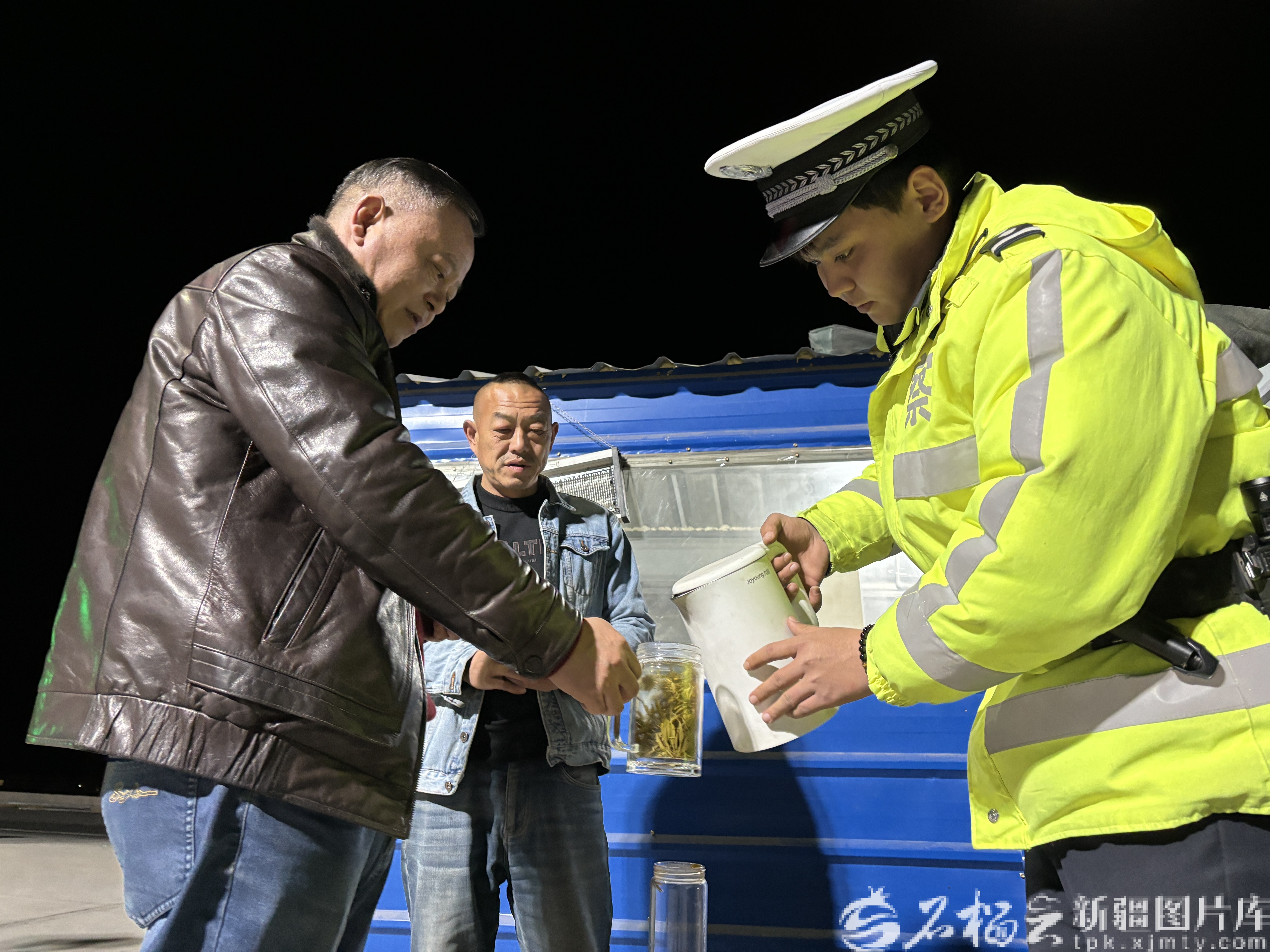 巴音郭楞蒙古自治州塔里木公安局交通管理大队为过往驾驶人送上热水。塔里木公安局供图