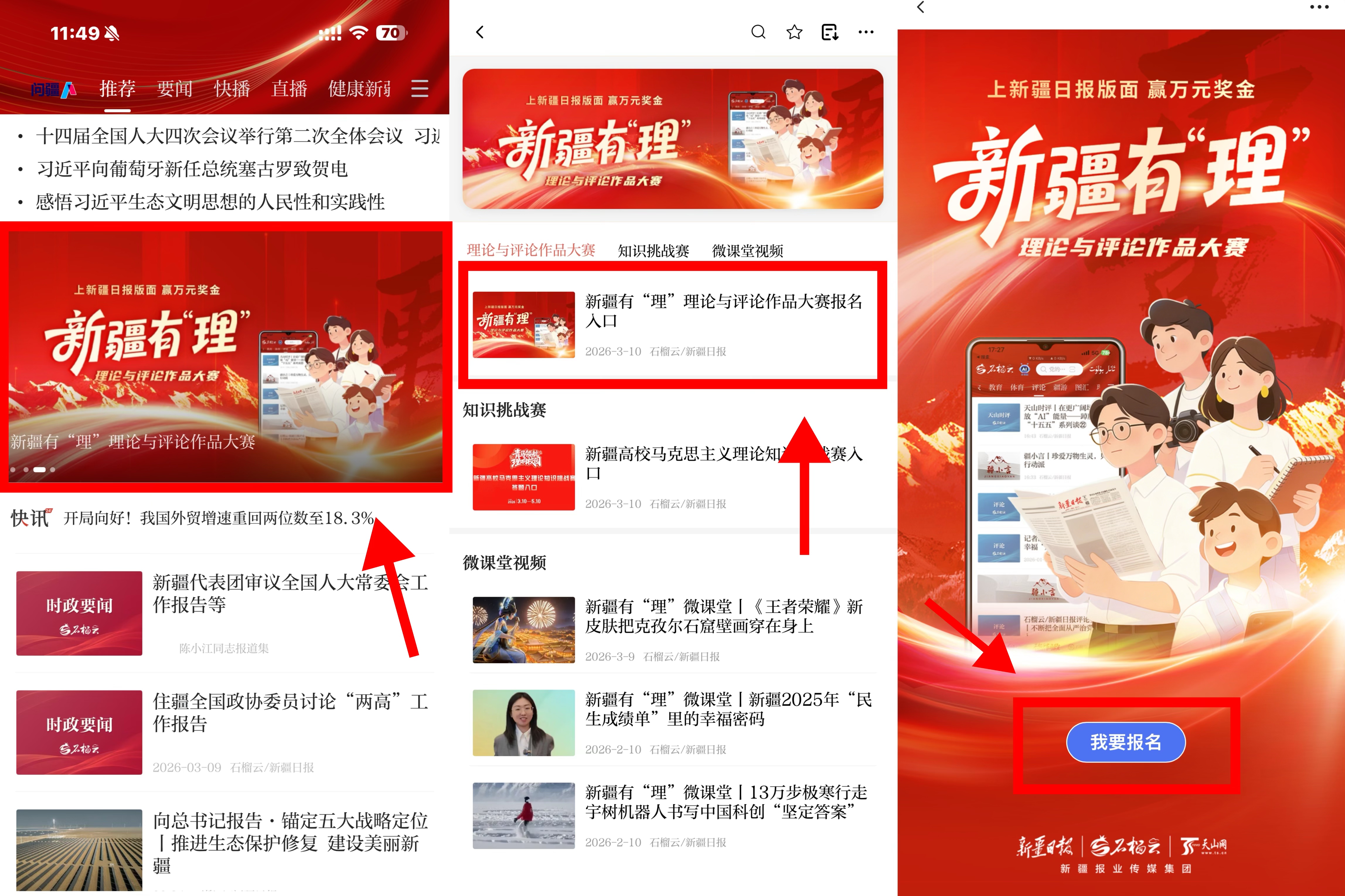 在首页轮播图找到新疆有“理”理论与评论作品大赛专题,选择新疆有“理”理论与评论作品大赛报名入口,点击进入后按要求填写相关信息。
