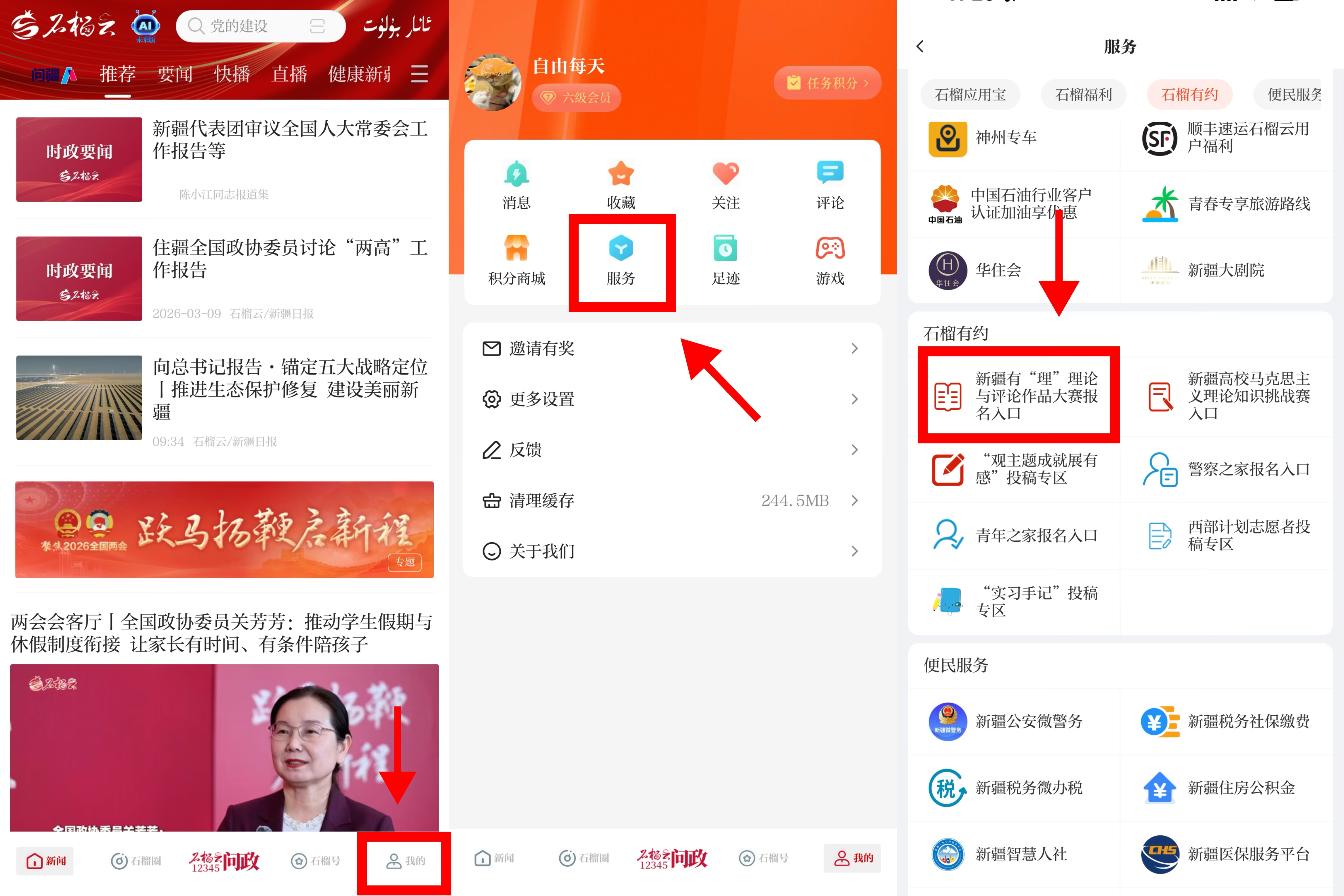 或者点击石榴云客户端右下角“我的”,进入“服务”板块,随后下拉页面,在“石榴有约”找到新疆有“理”理论与评论作品大赛报名入口。