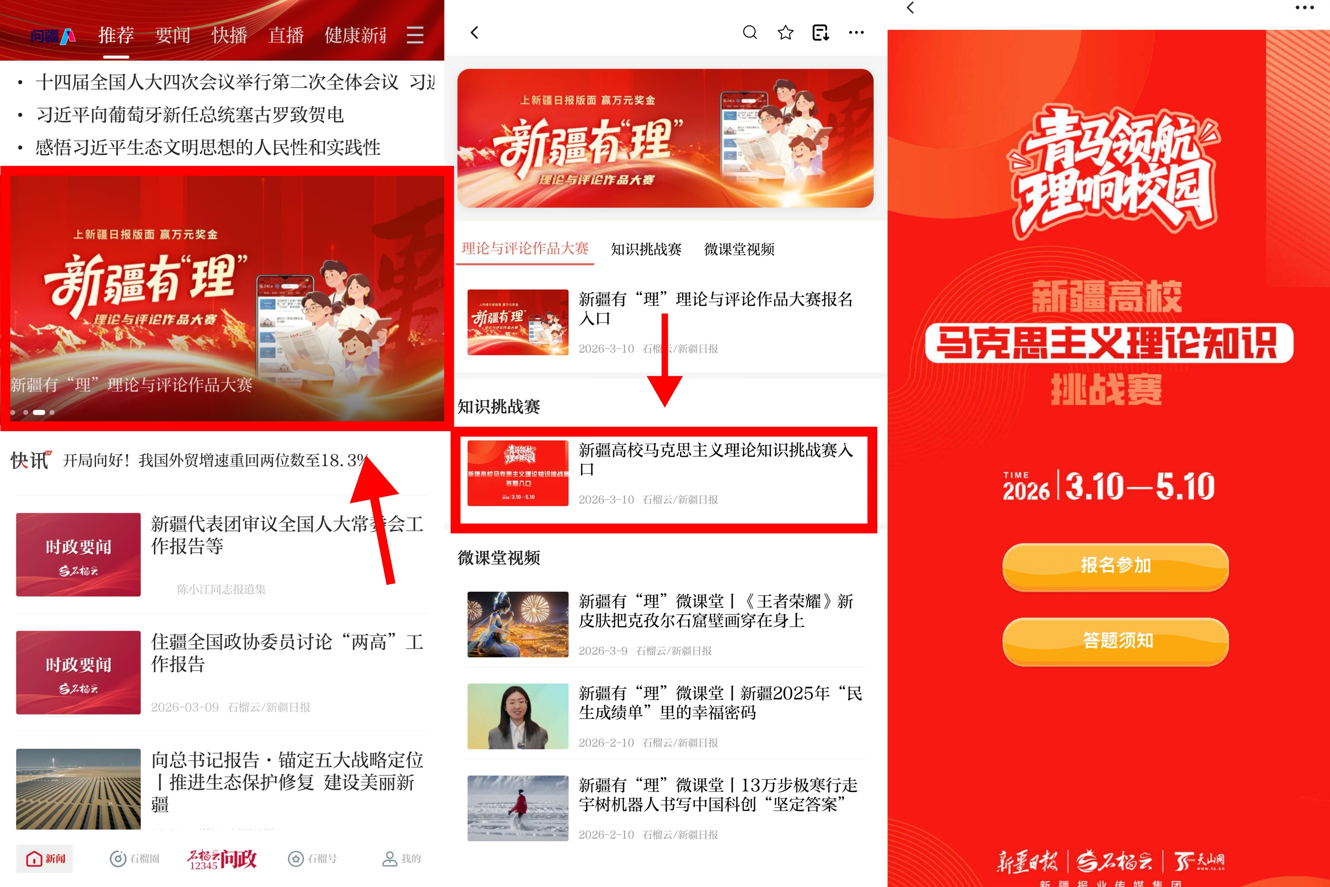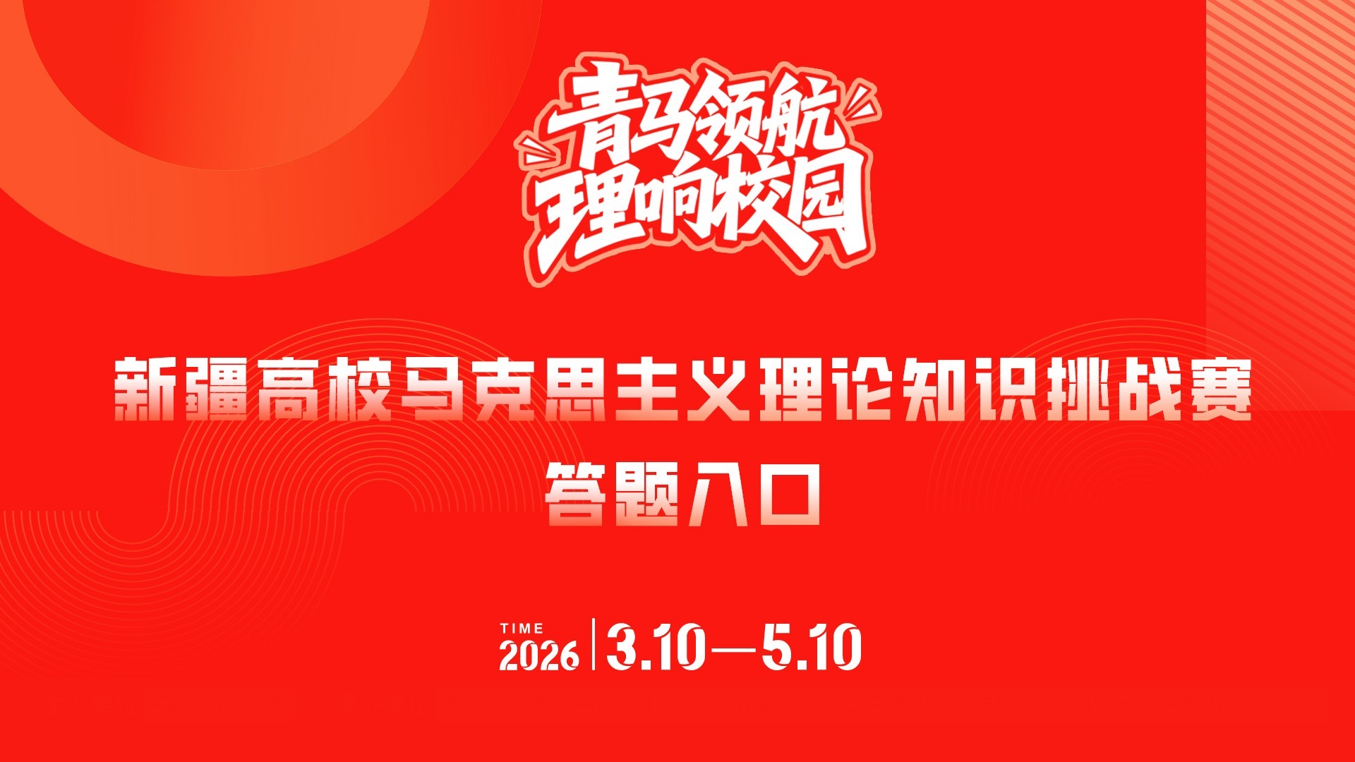 为进一步推动党的创新理论学习走深走实,拓展青年理论学习渠道,不断创新理论学习形式、丰富理论学习载体,由自治区党委网信办、自治区教育厅、自治区团委、新疆日报社(集团)主办的新疆有“理”理论与评论作品大赛3月10日正式启动,2026年“青马领航·理响校园”新疆高校马克思主义理论知识挑战赛(第二季)也同步上线,为广大青年理论学习注入全新活力。