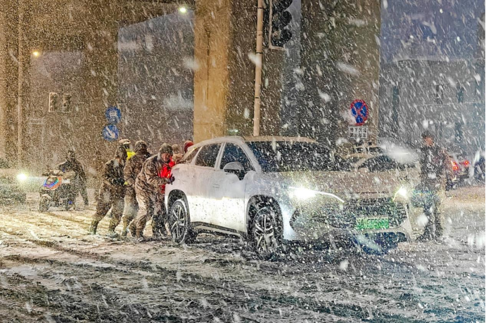 “1、2,加油推!”现场呐喊声此起彼伏。官兵们不畏严寒、并肩作战。大家分工明确、配合默契,清雪除障、推车救援、疏导车流,全力保障道路通行安全并提醒驾驶员减速慢行、谨慎驾驶。