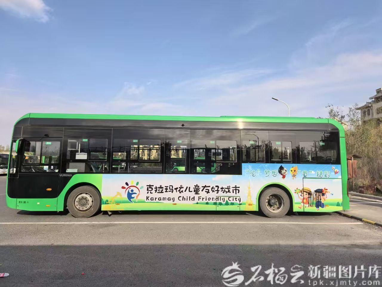 克拉玛依市印有克拉玛依儿童友好城市的公共汽车。(资料图)
