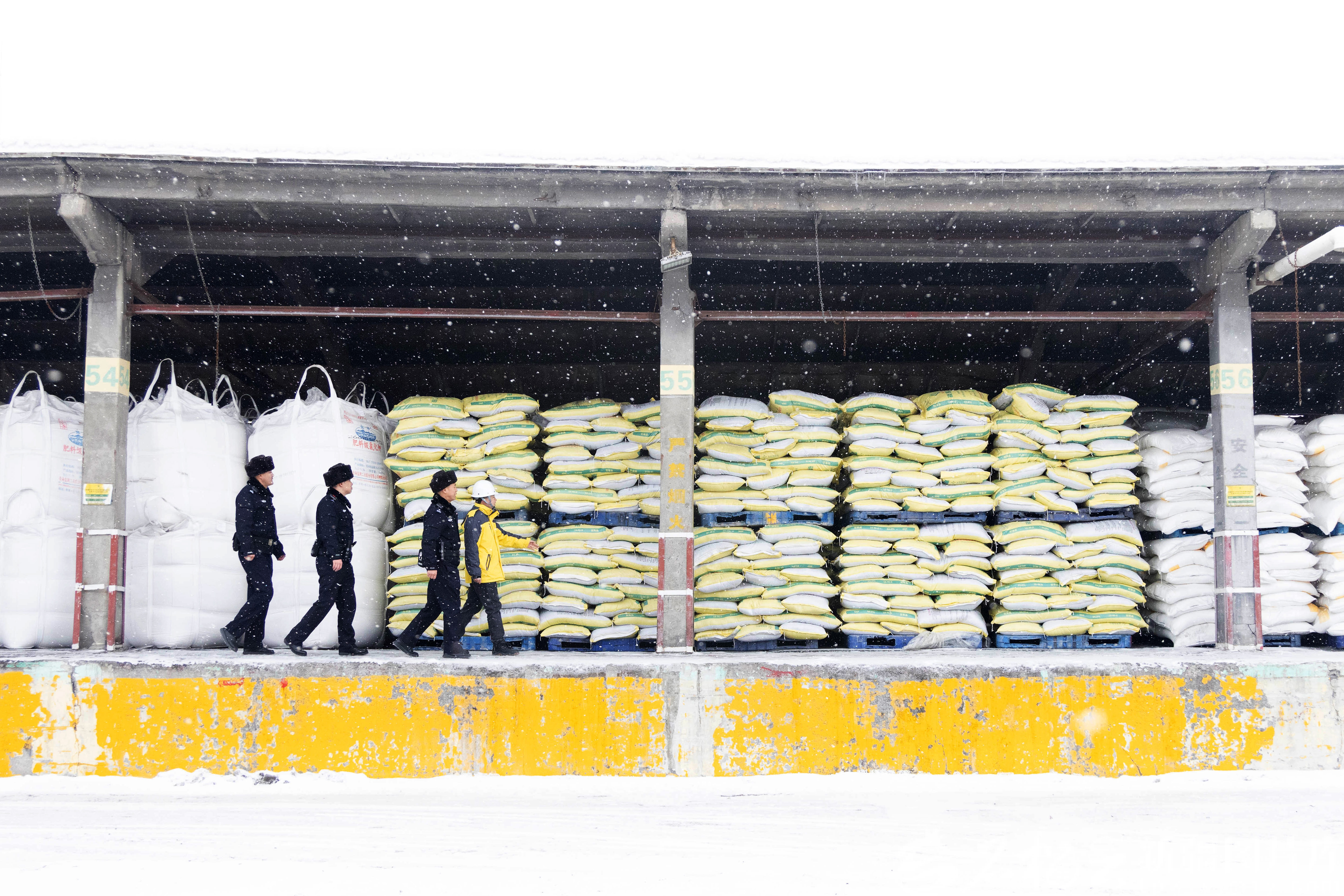 2月26日,在新疆农资(集团)有限责任公司乌鲁木齐北站仓储分公司农资专用铁路货场,乌鲁木齐铁路公安处乌鲁木齐北站派出所民警进行隐患排查。乌鲁木齐铁路公安处供图