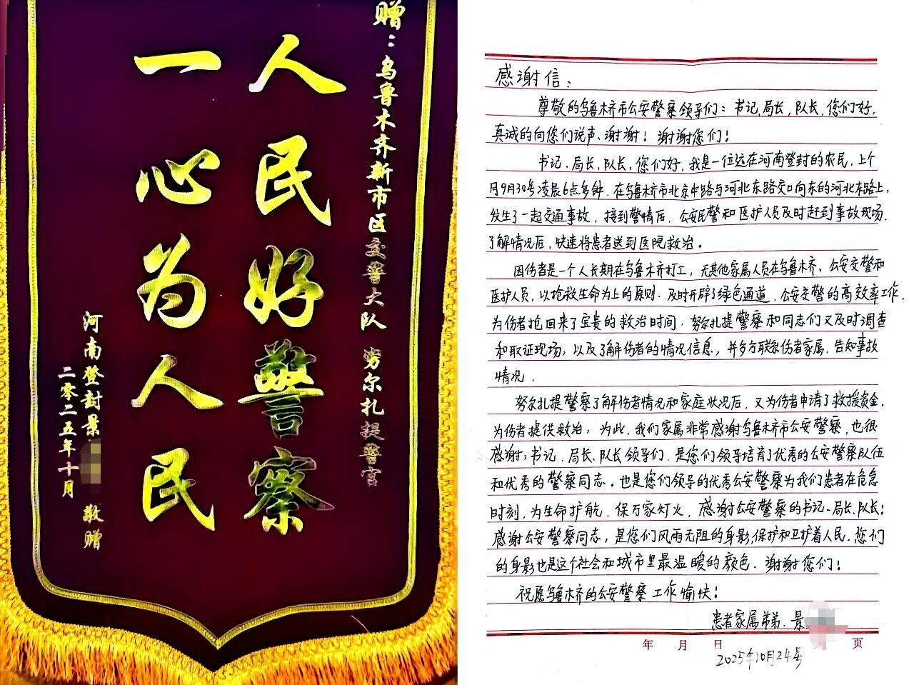 景先生弟弟寄来的感谢信和锦旗。乌鲁木齐市公安局提供