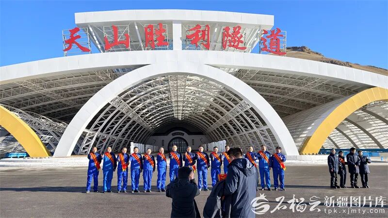 2025年12月26日,乌鲁木齐至尉犁高速公路建设者在天山胜利隧道口留念。当日,乌尉高速公路全线通车。石榴云/新疆日报记者 汤永摄