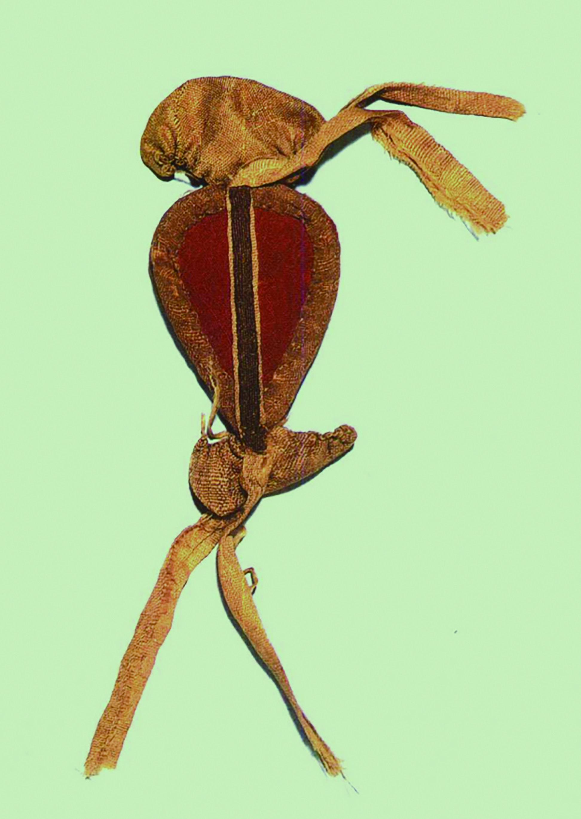 尉犁县营盘墓地出土的帛鱼。长26.8厘米,红绢面,黄绮镶边,缝缀成鱼形,是一种佩饰。摘自《新疆文物古迹大观》