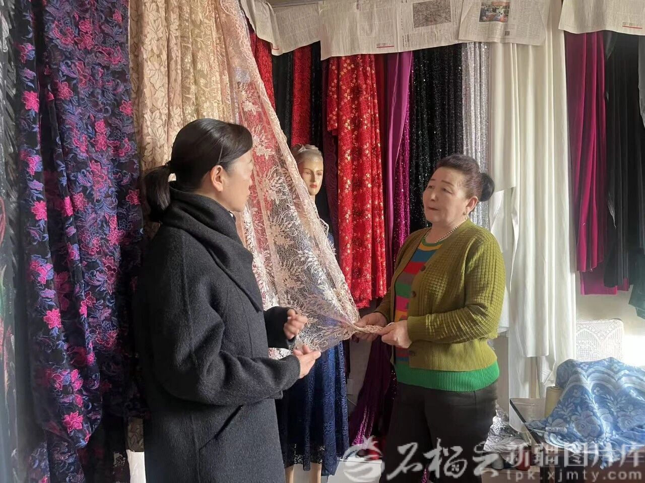 玛依拉(右)向参观者介绍刺绣产品。受访者供图