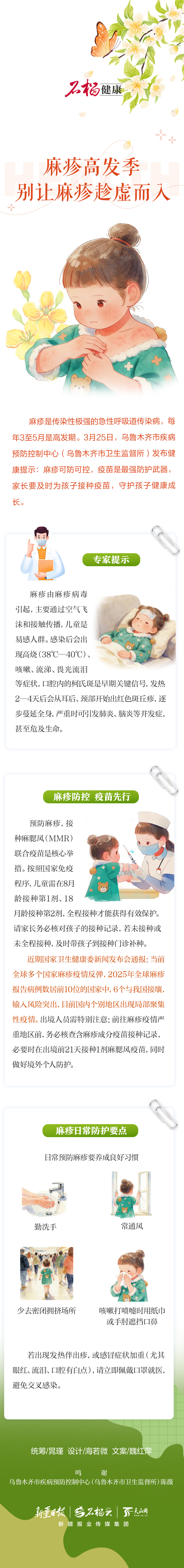麻疹是传染性极强的急性呼吸道传染病,每年3至5月是高发期。3月25日,乌鲁木齐市疾病预防控制中心(乌鲁木齐市卫生监督所)发布健康提示:麻疹可防可控,疫苗是最强防护武器,家长要及时为孩子接种疫苗,守护孩子健康成长。