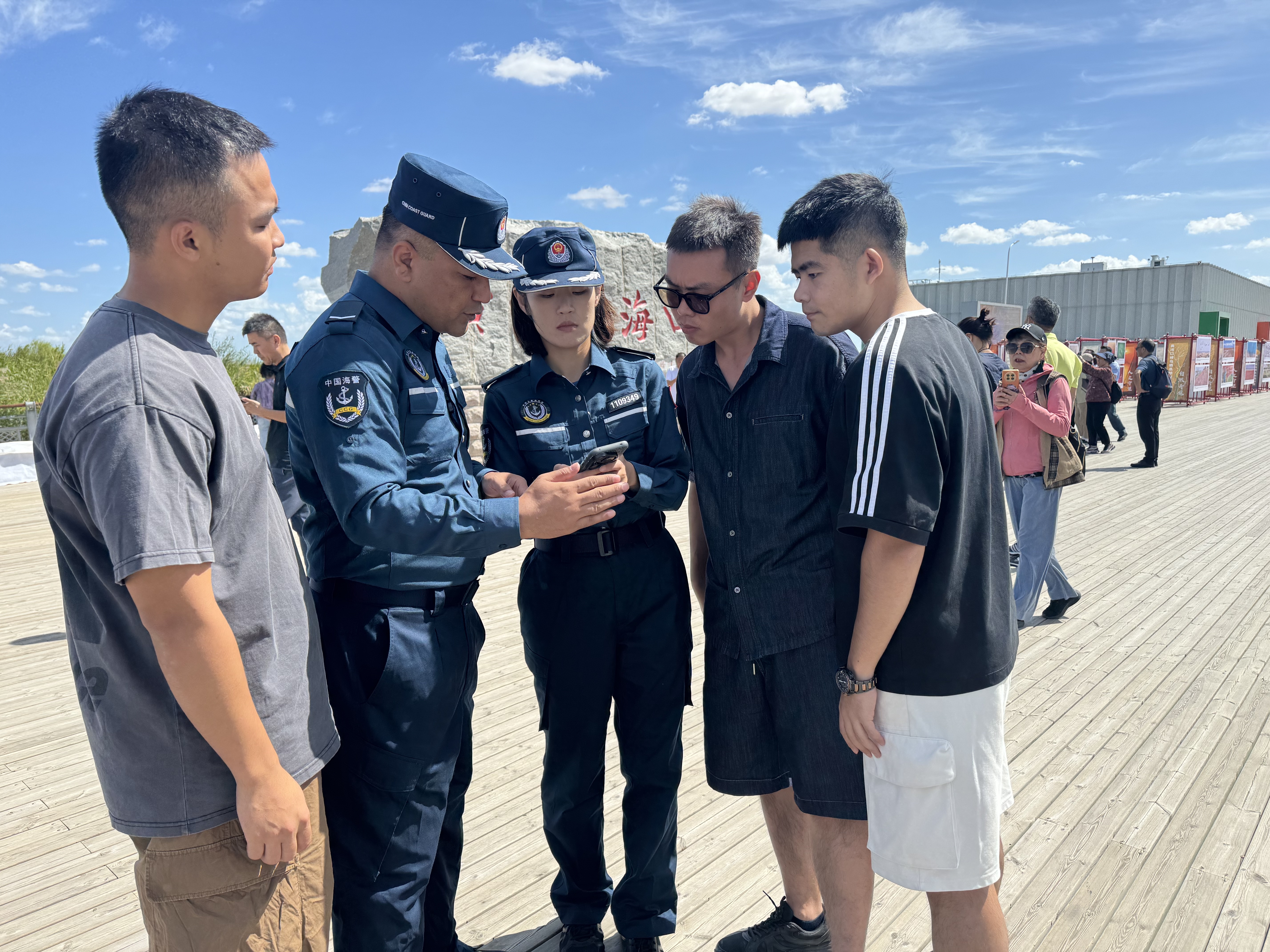 2025年5月,“馕警官”(左二)与中国海警在海南省各景区向游客进行普法宣传,并共同拍摄普法短视频。通讯员 杨磊摄