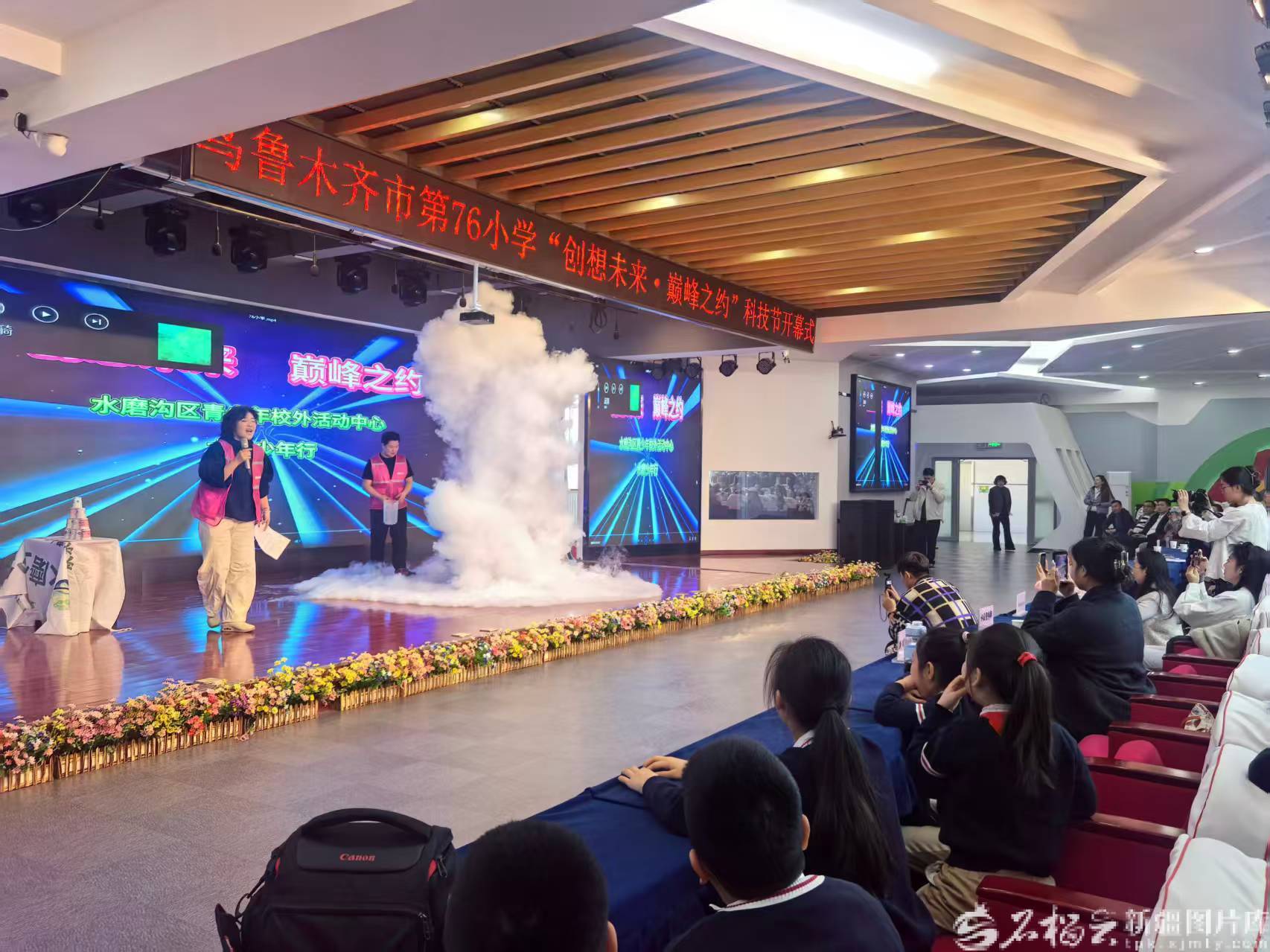 台上,一场“科学实验秀”正上演最惊险的一幕:滚烫的开水倒入装有液氮的容器,一团白色蘑菇云瞬间腾空而起,雾气在聚光灯下折射出七彩光晕,整个舞台仿佛变成了魔法世界。