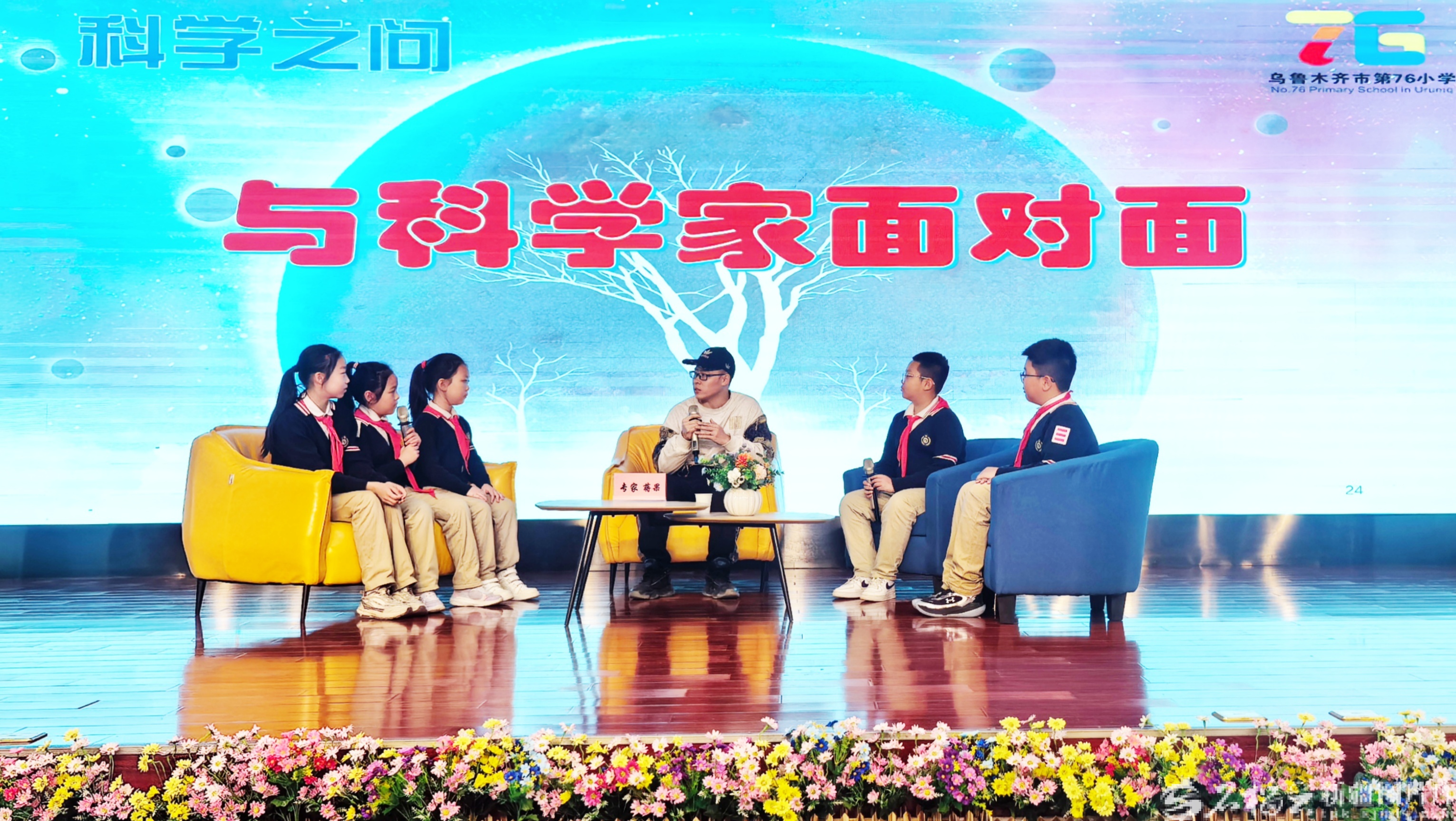当天最动人的环节,当属“巅峰对话——我与科学家面对面”。台上中国科学院新疆生态与地理研究所的蒋果博士,与对面5名小学生,展开交流。