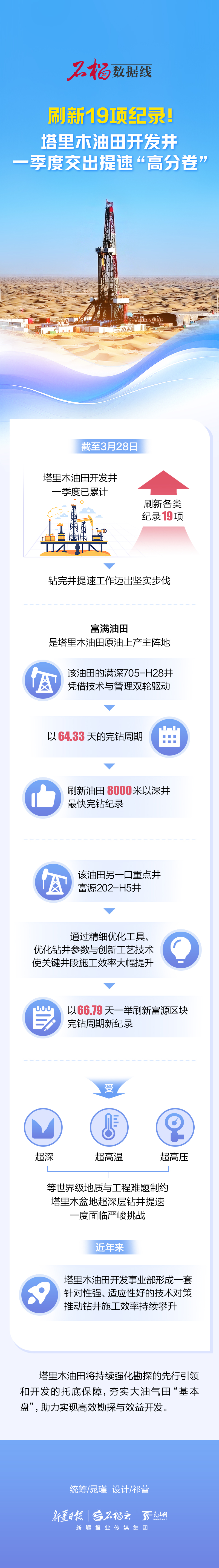 截至3月28日,塔里木油田开发井一季度已累计刷新各类纪录19项,钻完井提速工作迈出坚实步伐。