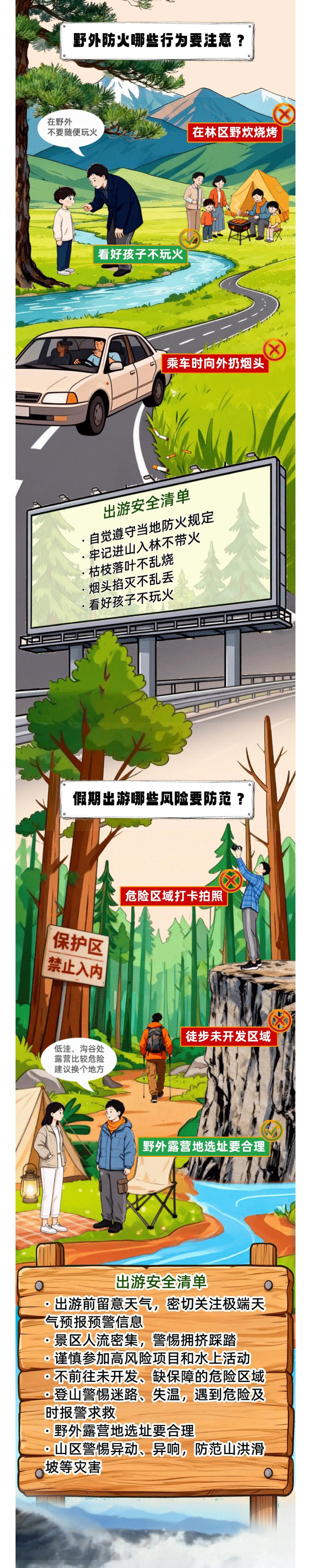 出游前留意天气,密切关注极端天气预报预警信息;景区人流密集,警惕拥挤踩踏;谨慎参加高风险项目和水上活动;不前往未开发、缺保障的危险区域;登山警惕迷路、失温,遇到危险及时报警求救;野外露营地选址要合理;山区警惕异动、异响,防范山洪滑坡等灾害。