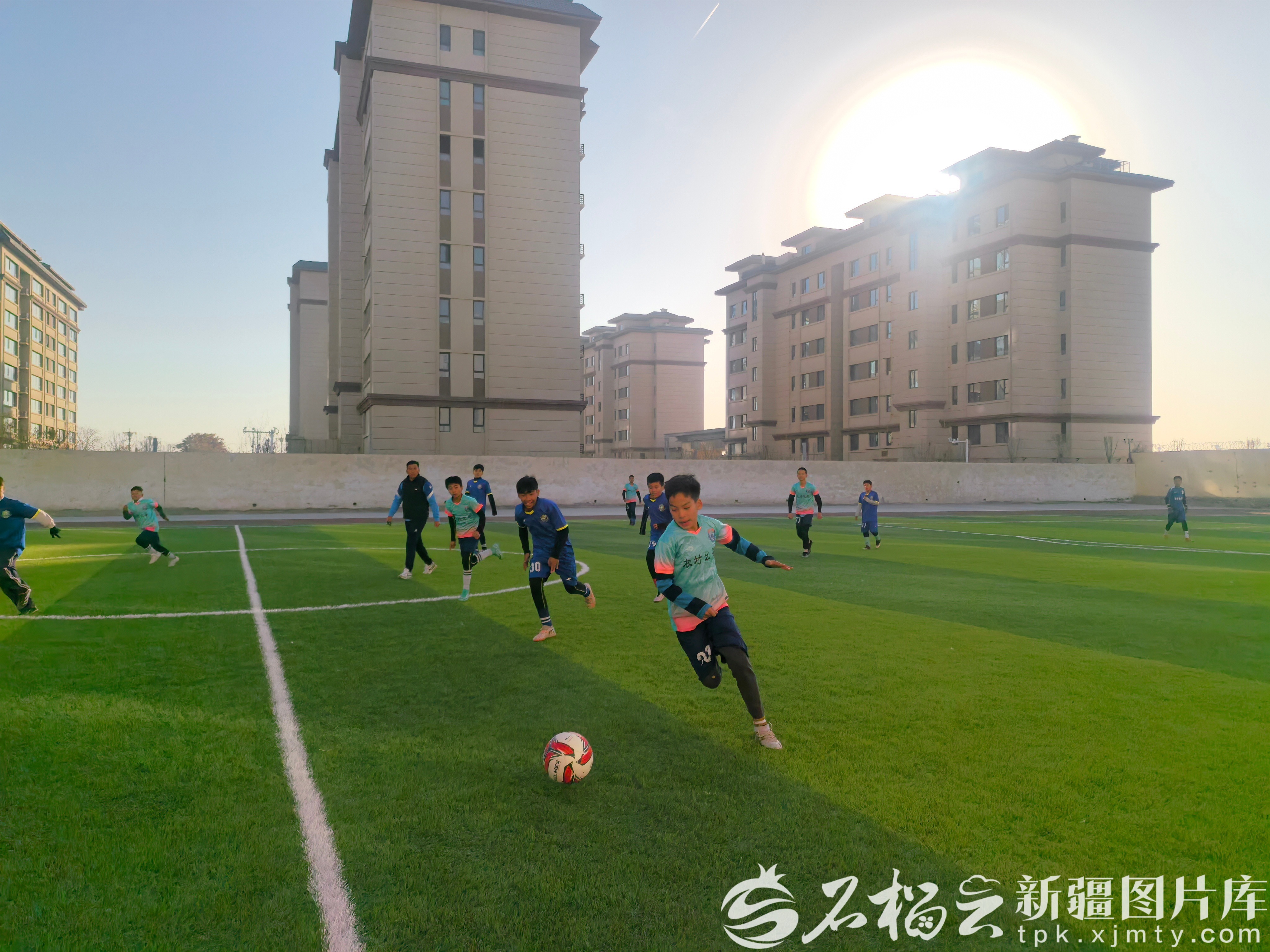 在和田市伊里其乡第二中心小学阿热勒村分校标准化足球场上,孩子们在崭新的场地上攻防角逐、尽情奔跑。王晓丽 摄