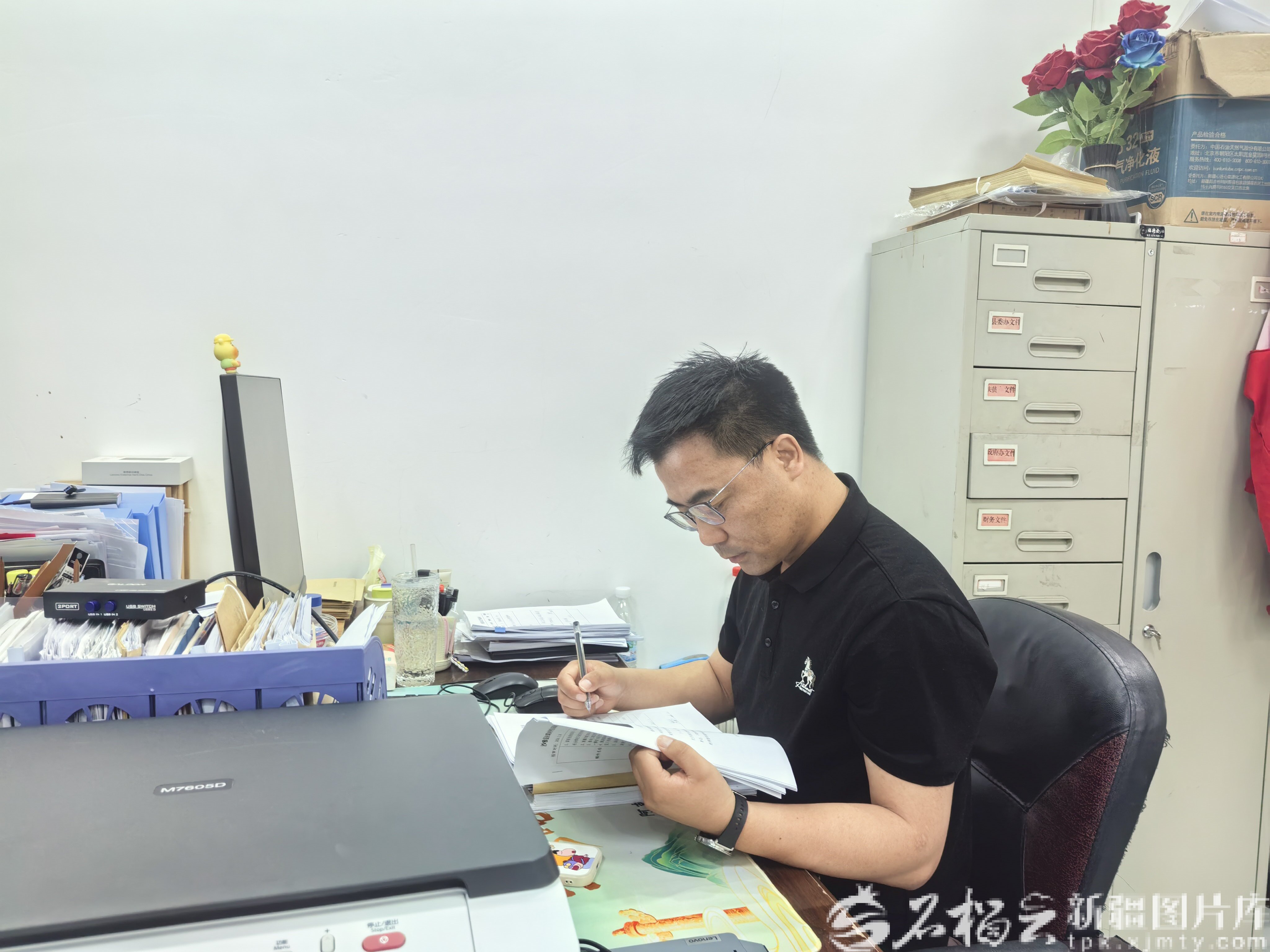 4月8日,哈万喜在办公室查阅资料。李素娜摄