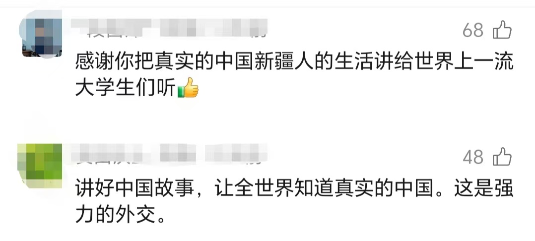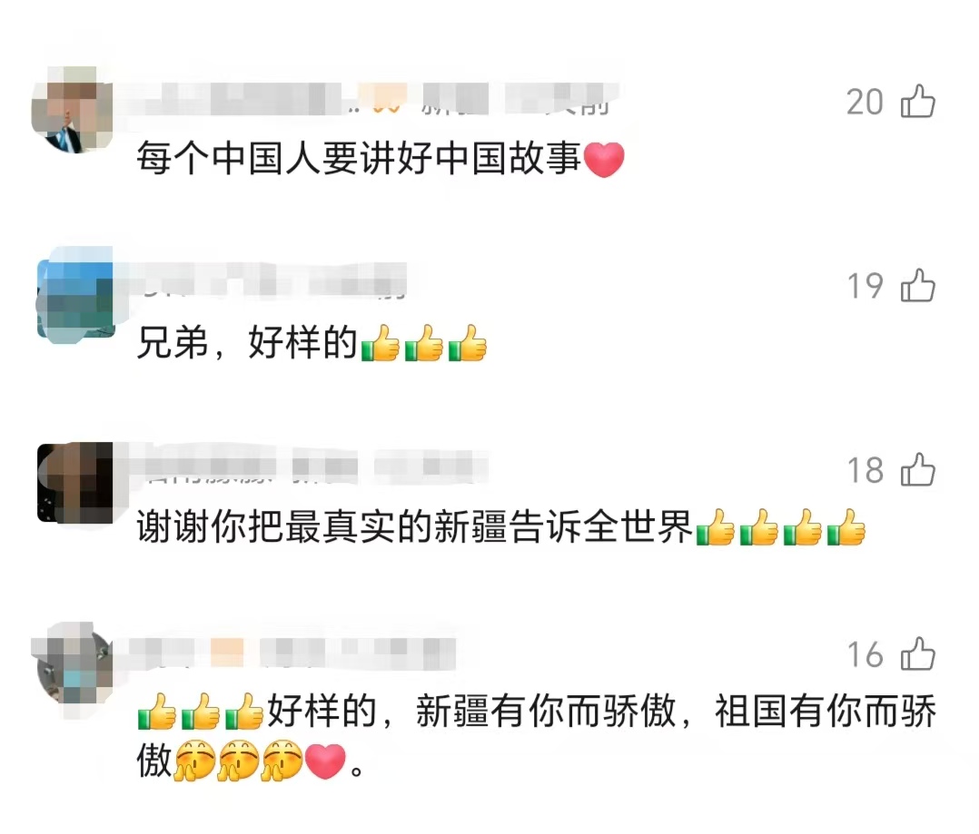 这条视频获得大量网友点赞,“谢谢你把最真实的新疆告诉全世界”“每个中国人要讲好中国故事”“你讲好了新疆故事,讲好了中国故事”……