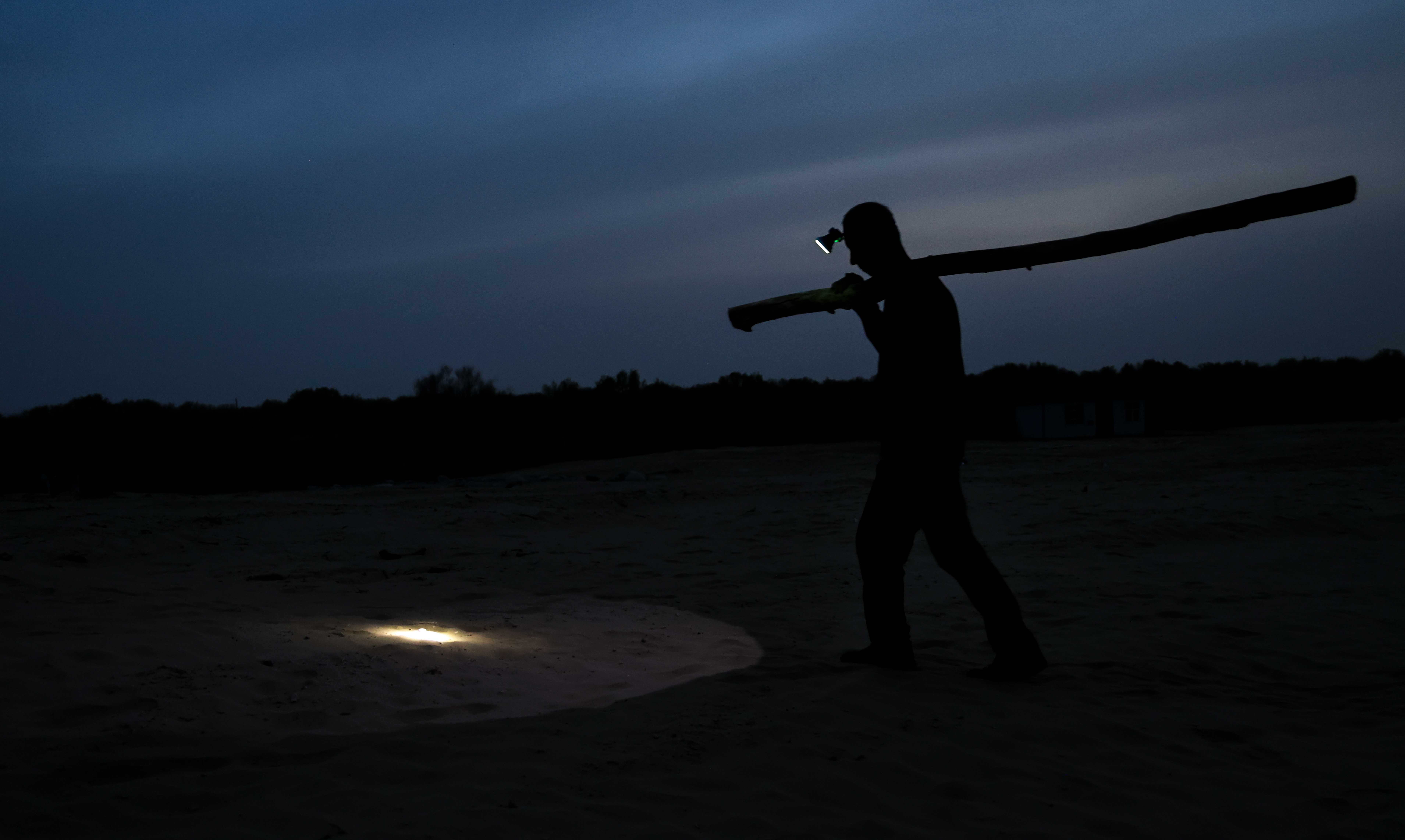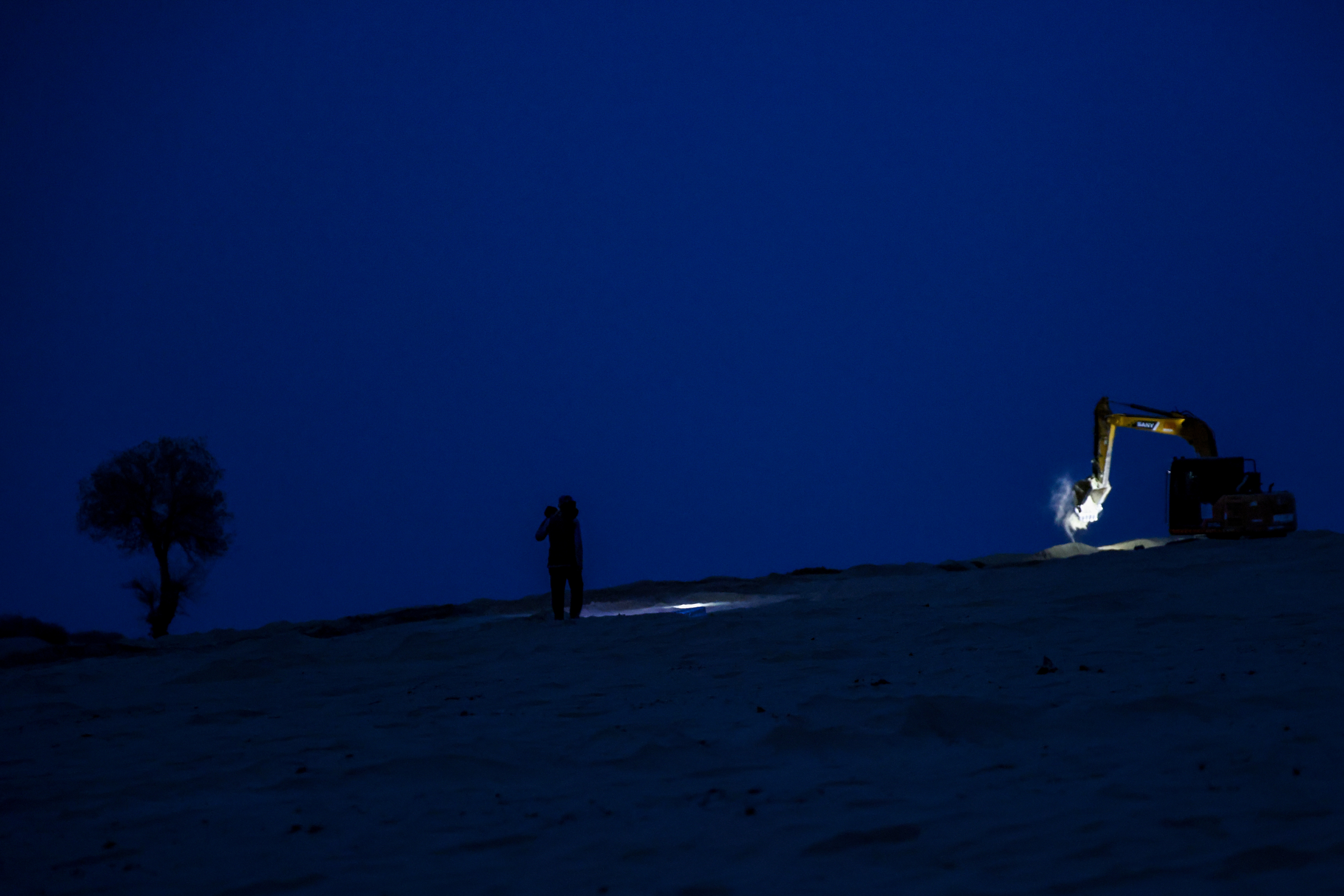 塔克拉玛干沙漠夜色中,胡杨、图尔洪、挖掘机依然在默默坚守。 许晓龙 摄