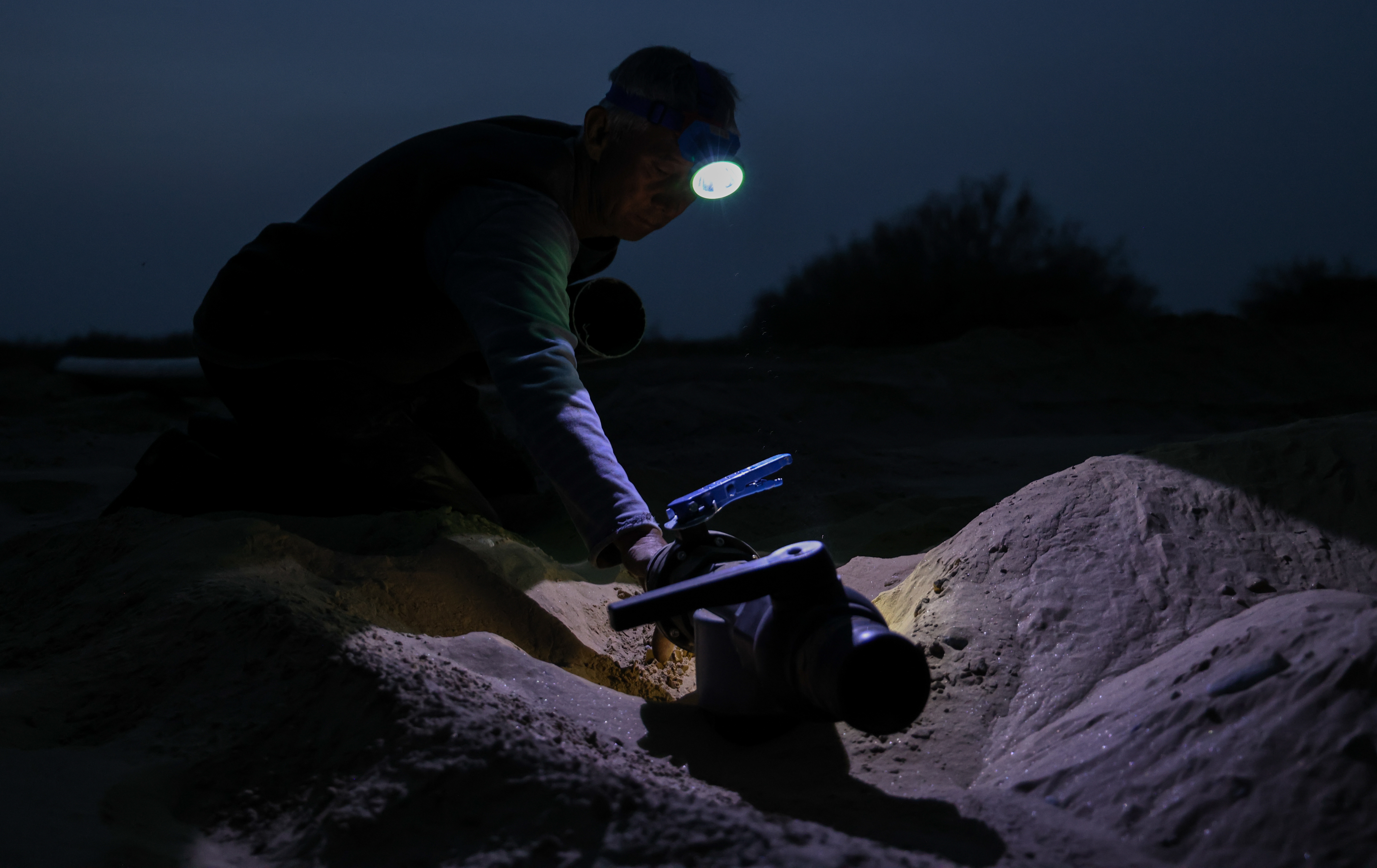 灯光柱扫过沙地,图尔洪望向不远处的挖掘机,抬手指挥开挖管道沟,弯腰扯直滴灌带。