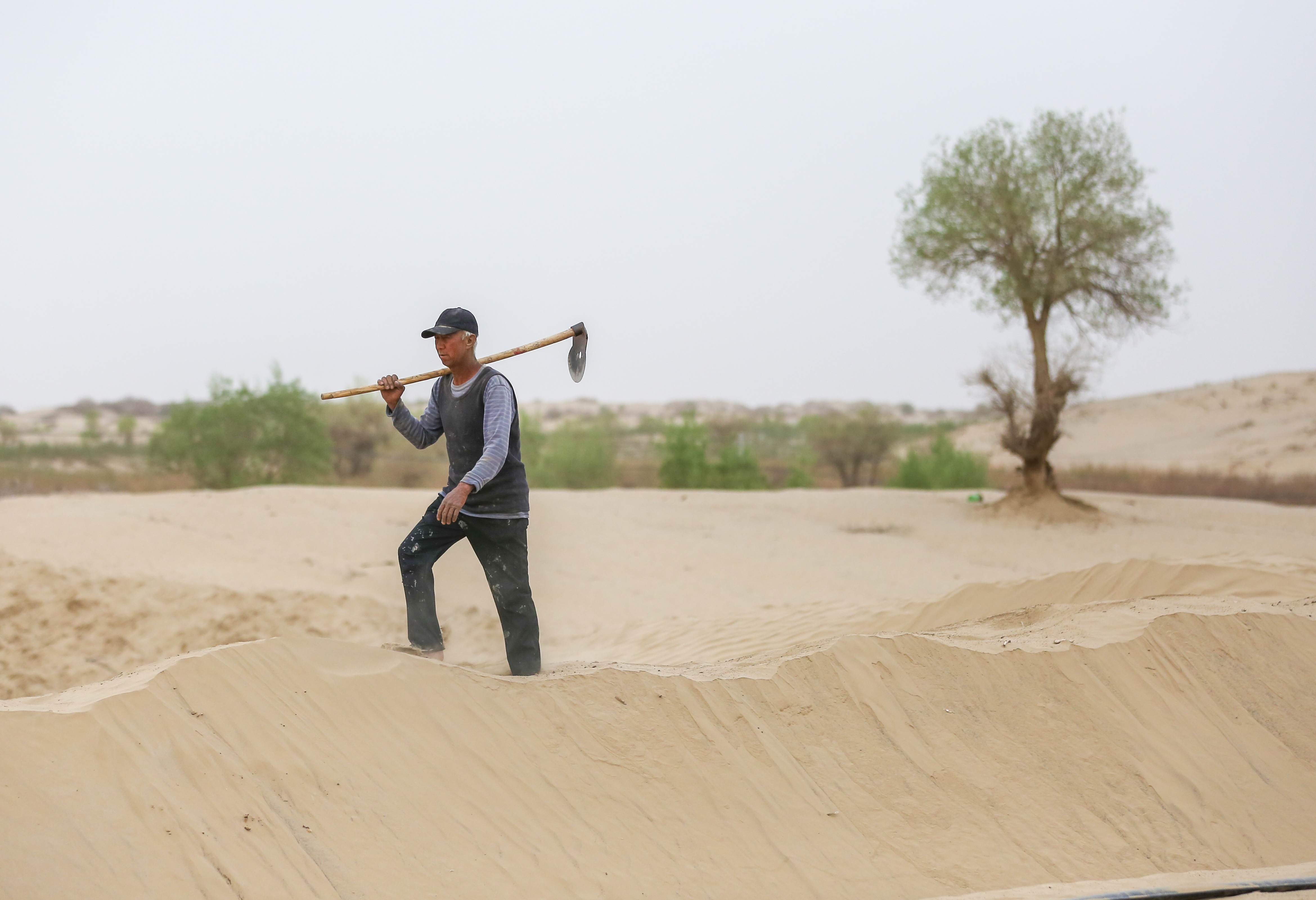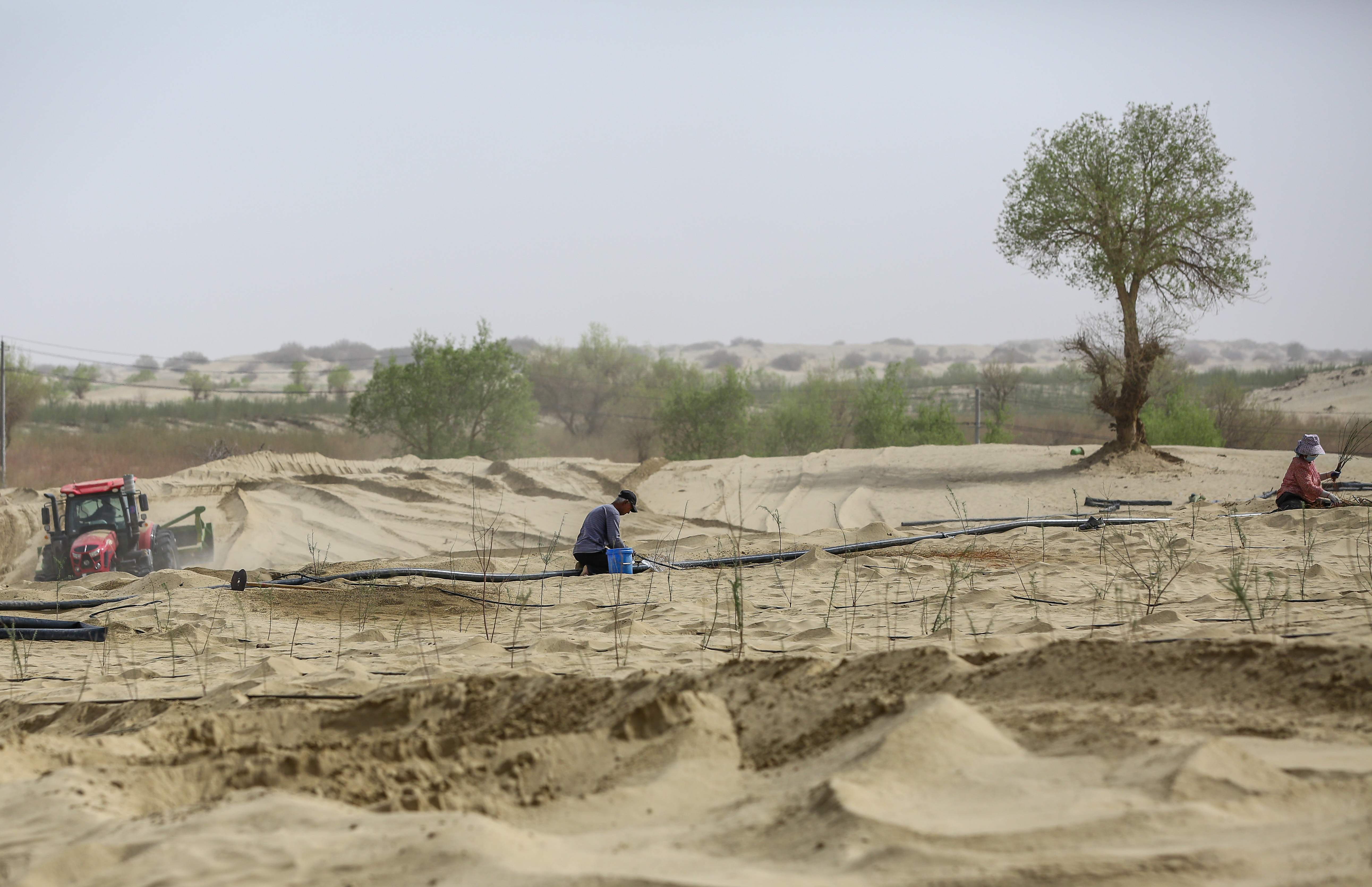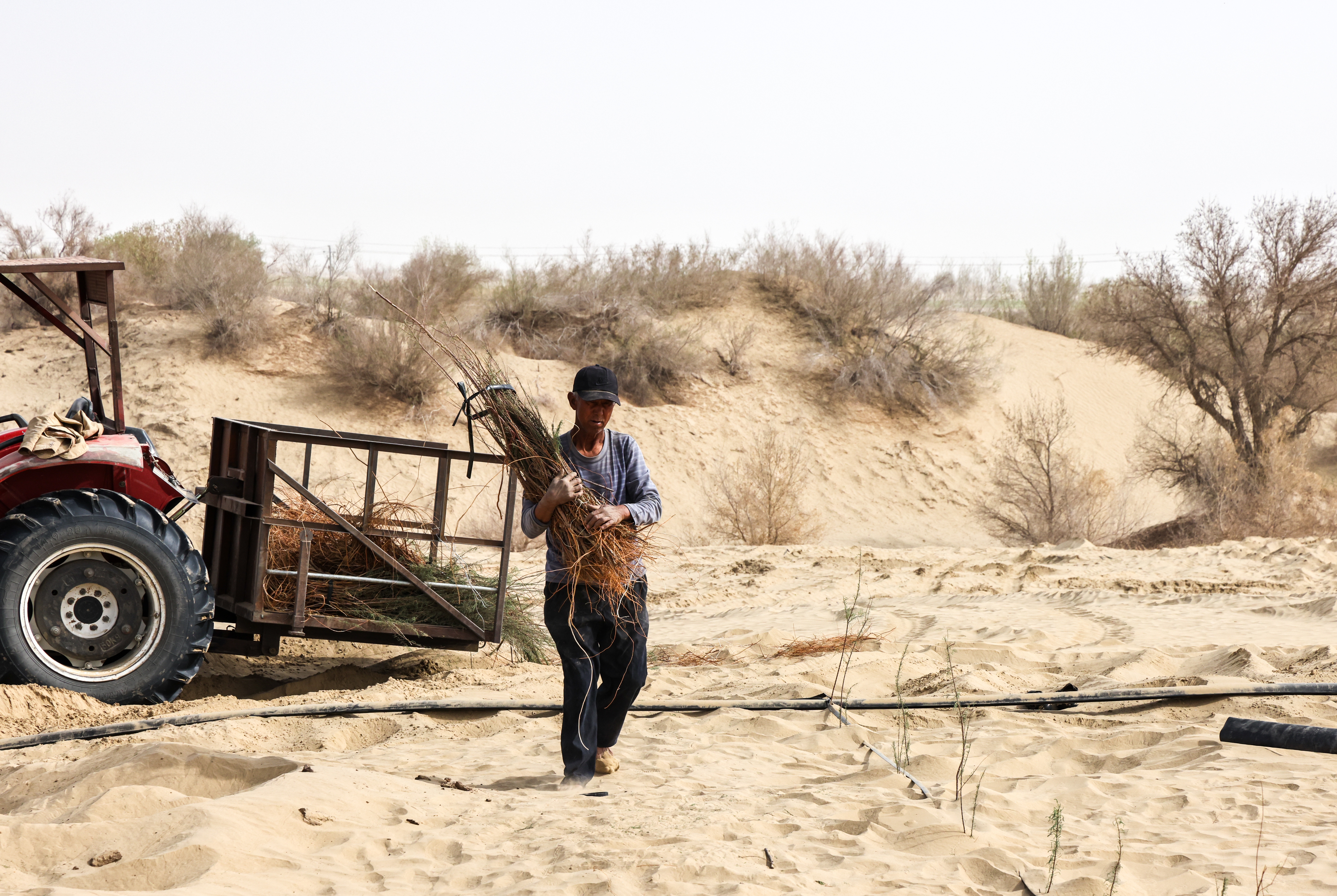 天不亮,他带上馕和水,往沙漠里走。天黑透,才拖着疲惫的身子回家。整地、挖坑、栽苗、浇水、管护,每一步都亲自上手。
