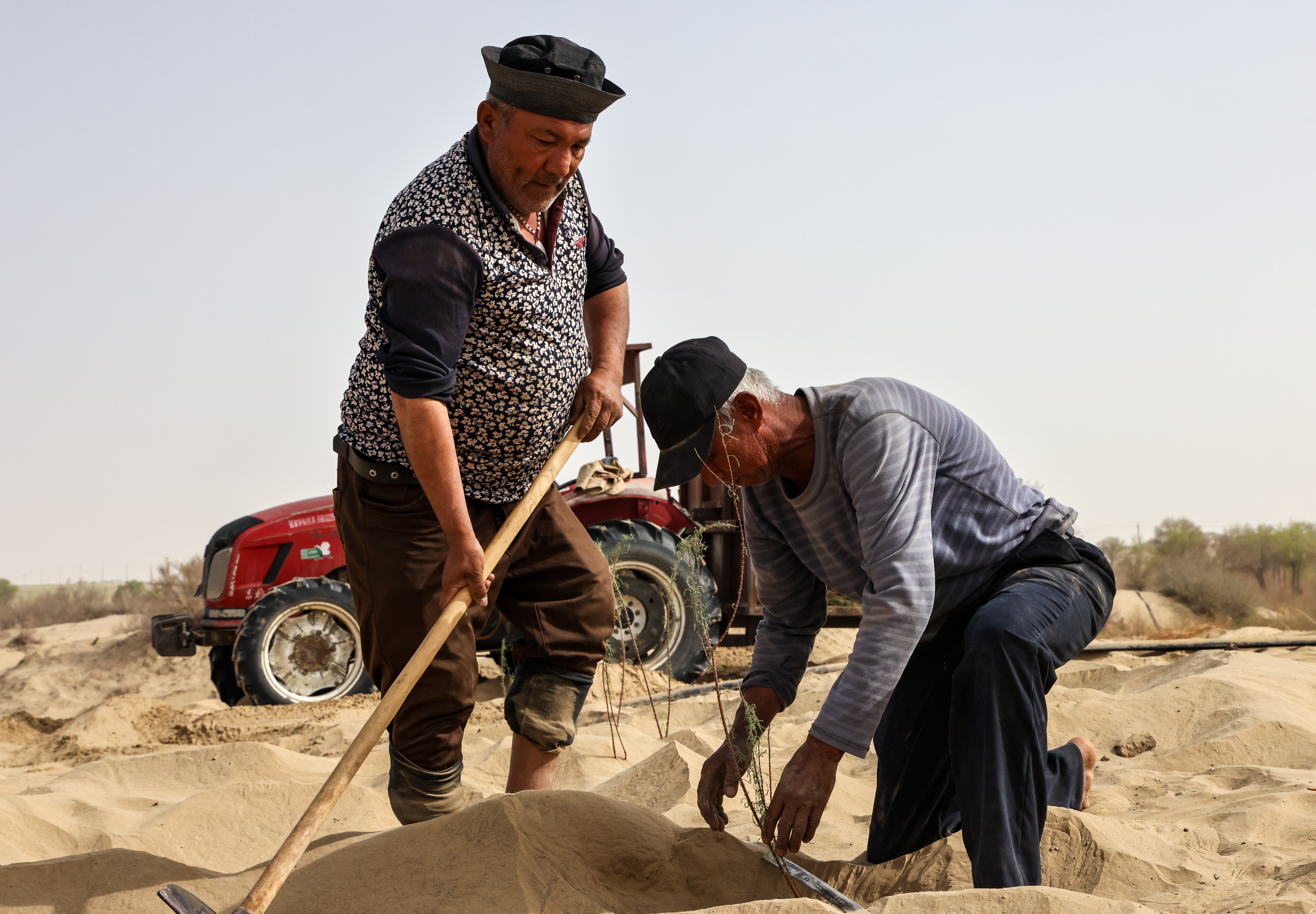 图尔洪和工人一起种下红柳苗。 许晓龙 摄