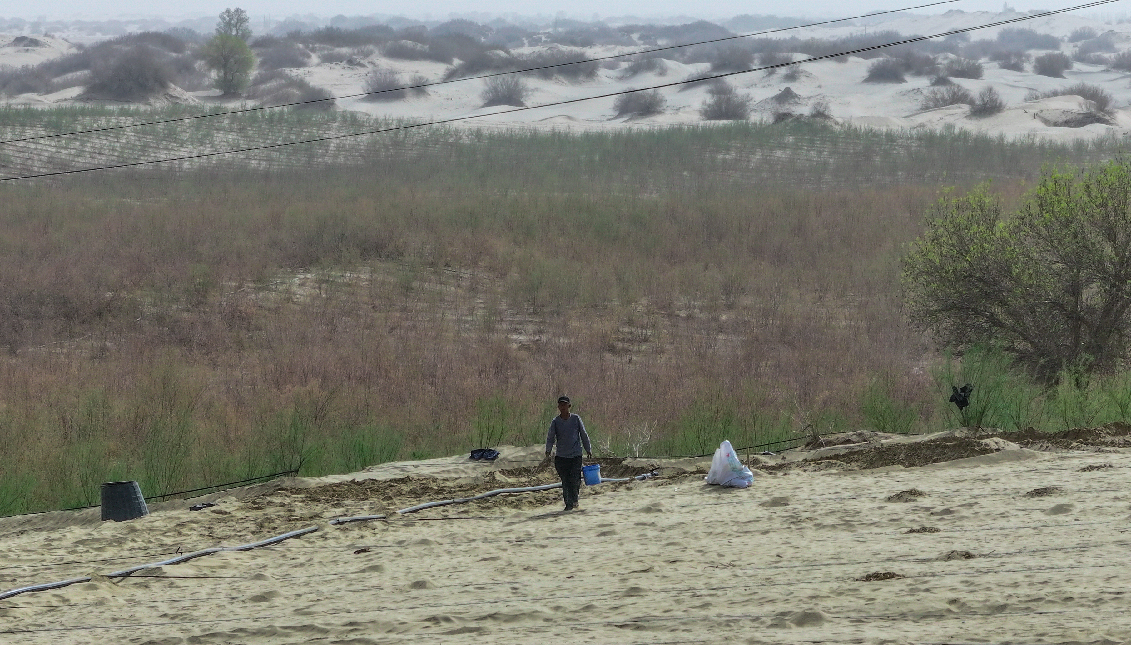 图尔洪种树的身影和远处片片绿色林带形成鲜明对比。 许晓龙 摄