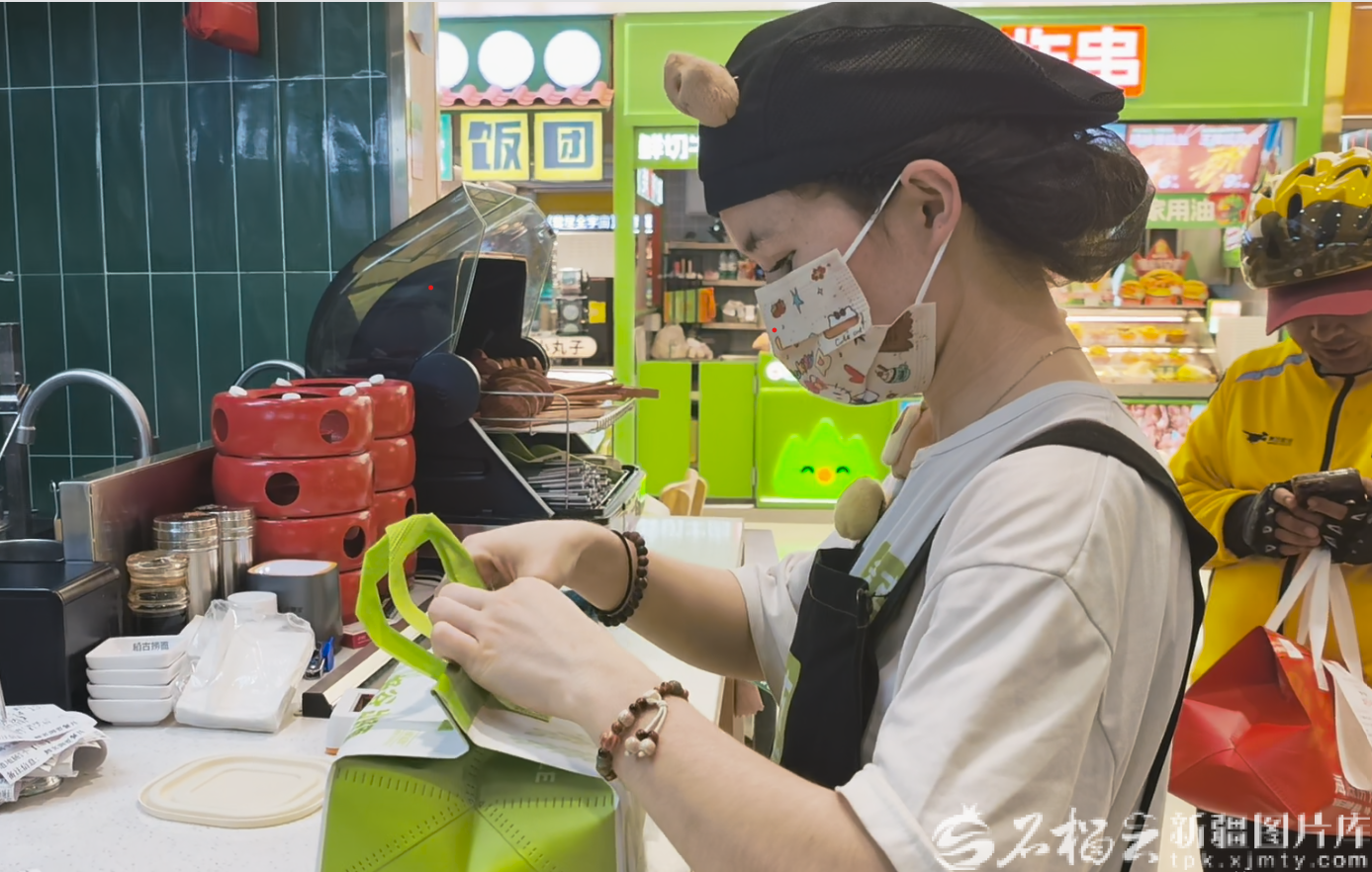 4月14日,乌鲁木齐市CCMALL时代广场一位外卖骑手取餐时核查“食安封签”。天山网-新疆日报记者 索蓉芝摄