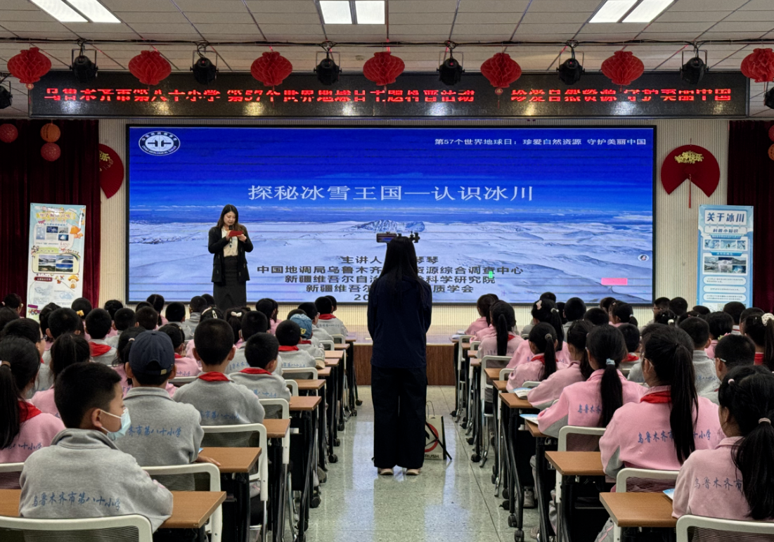 自治区地质学会联合多家单位走进乌鲁木齐市第八十小学,打破传统科普模式,用“讲座+互动+展览+直播”的新潮玩法,为师生们带来了一场干货满满的地球科学盛宴。授课专家围绕“探秘冰雪王国——认识冰川”开讲,从冰川的形成、栖息地,到雪山与冰川的关联,用生动案例拆解专业知识,让同学们直观感受到地球家园的珍贵与脆弱,也点燃了大家探索地质奥秘的热情。