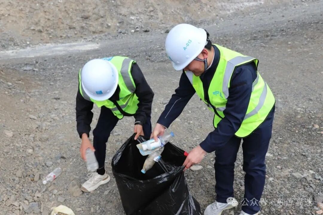 G3033线奎独库高速土建施工1标联合奎屯河引水工程建设管理局的党员干部、青年职工,走出工地、走进自然,在将军庙水库周边开展环境清理志愿活动。大家手持垃圾袋和夹子,沿着水库岸线仔细捡拾塑料袋、饮料瓶等生活垃圾。