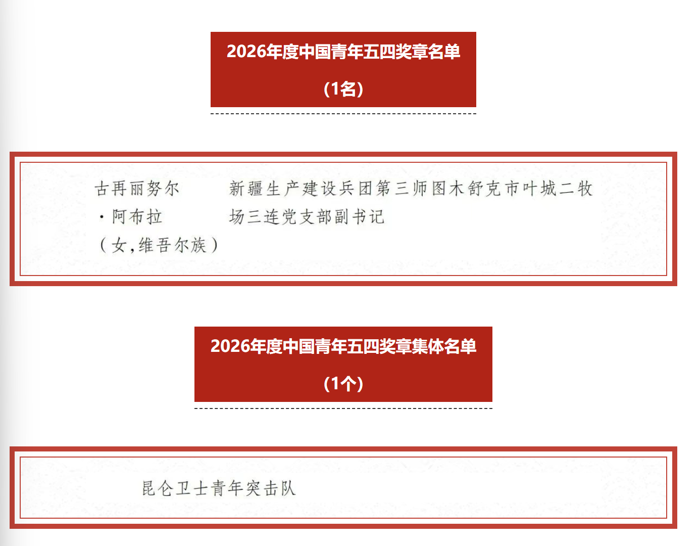其中,新疆生产建设兵团第三师图木舒克市叶城二牧场三连党支部副书记古再丽努尔・阿布拉被授予中国青年五四奖章;昆仑卫士青年突击队被授予中国青年五四奖章集体。此外,新疆广播电视台记者海米提・买买提、阿克苏地区库车市消防救援大队政治委员李运飞、阿拉尔市叁颗枣果品农民专业合作社理事长赵闫等22名青年,荣获2026年度新时代青年先锋称号。