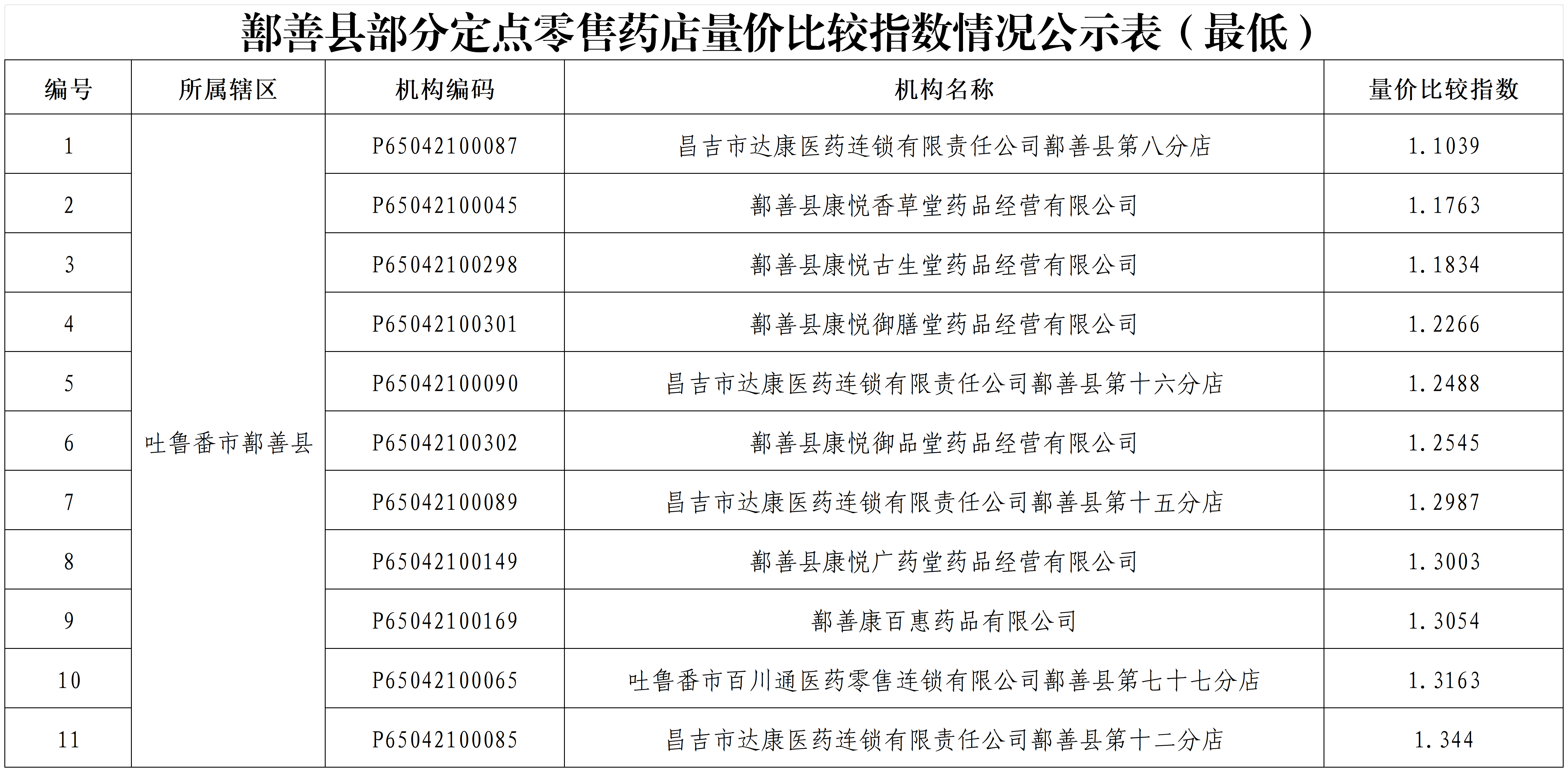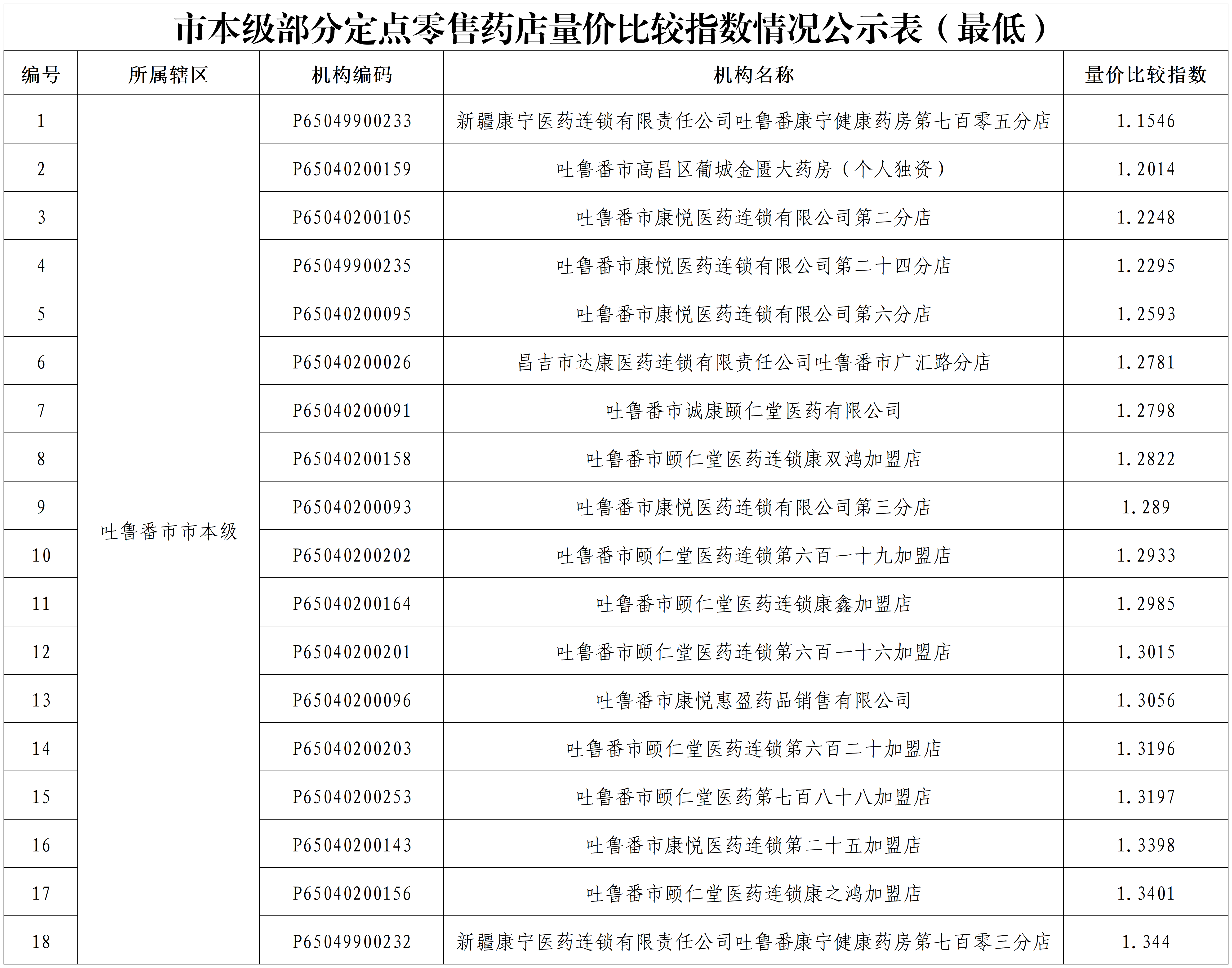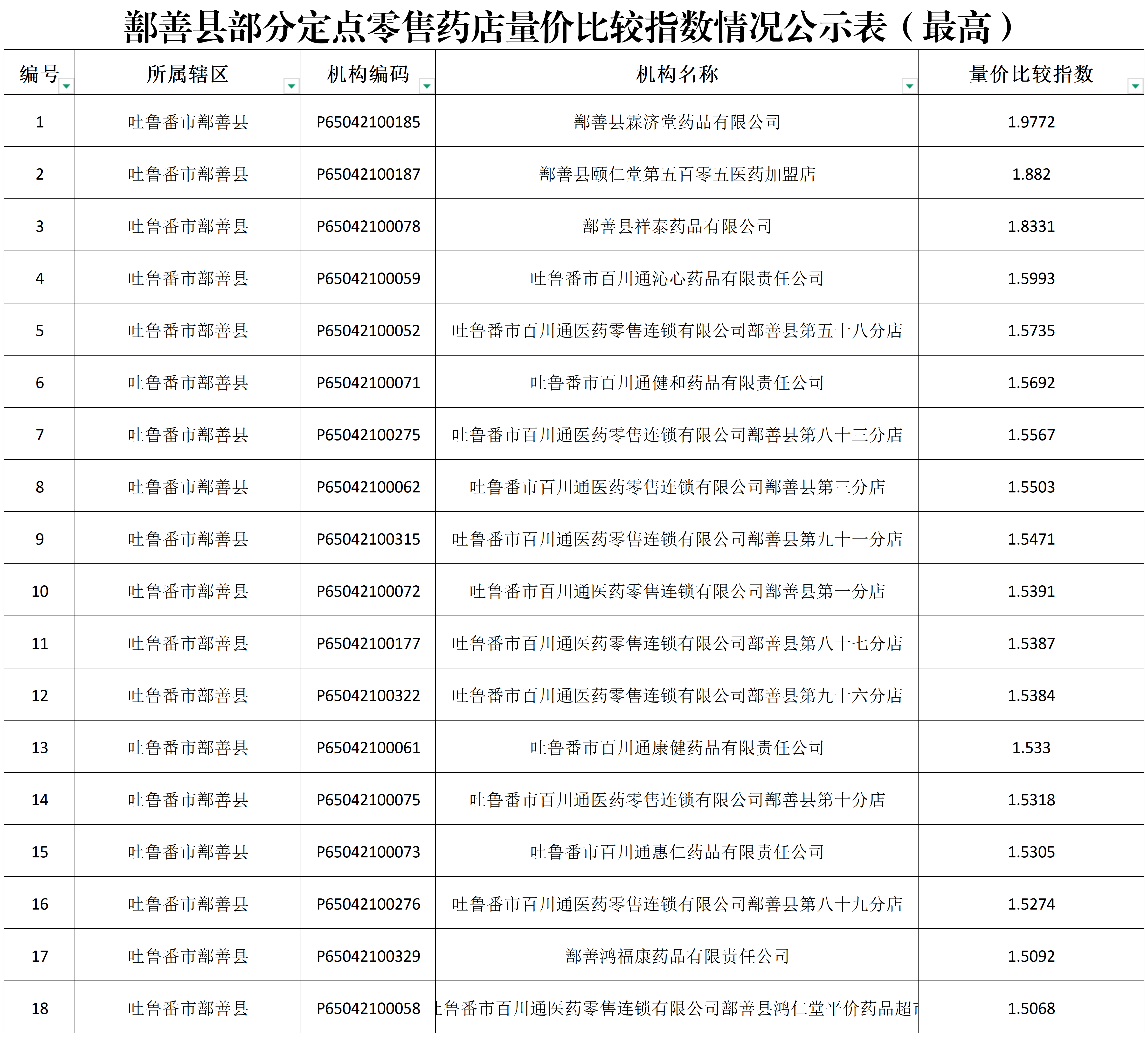 吐鲁番市2025年定点零售药店量价比较指数情况公示(第一批)