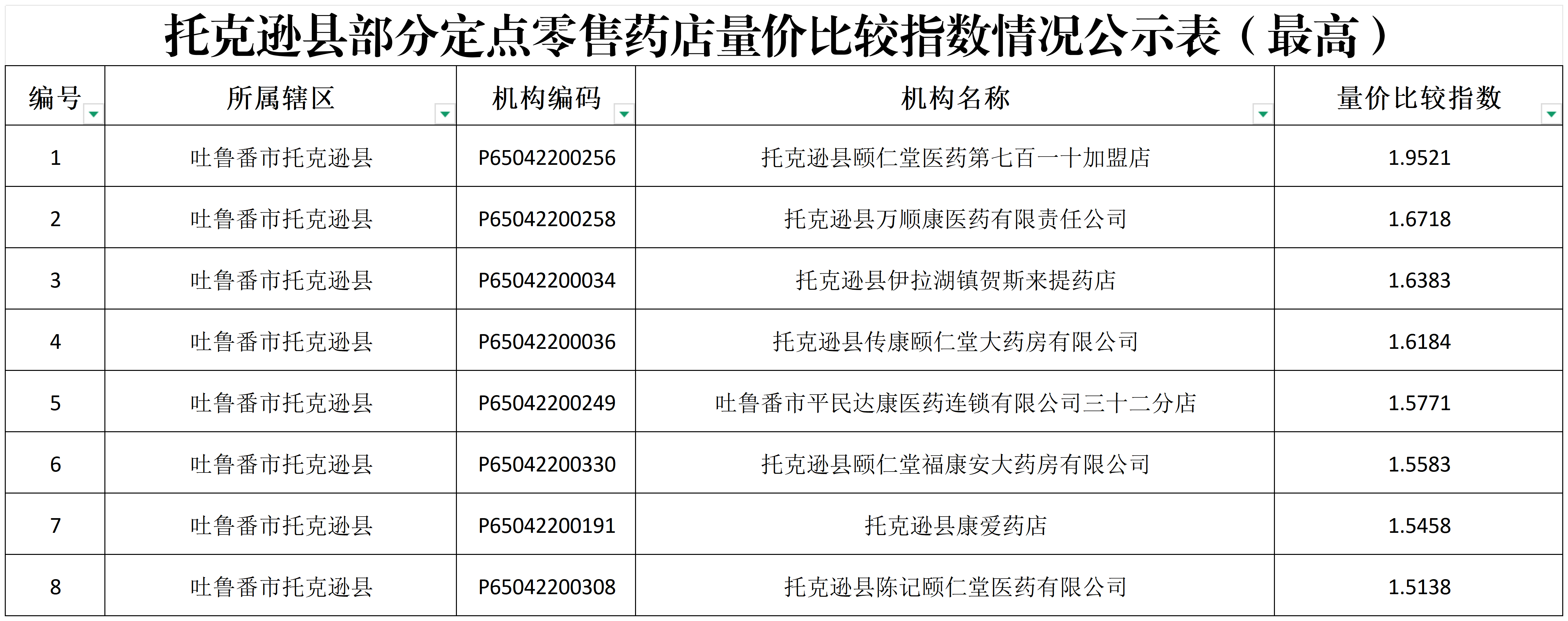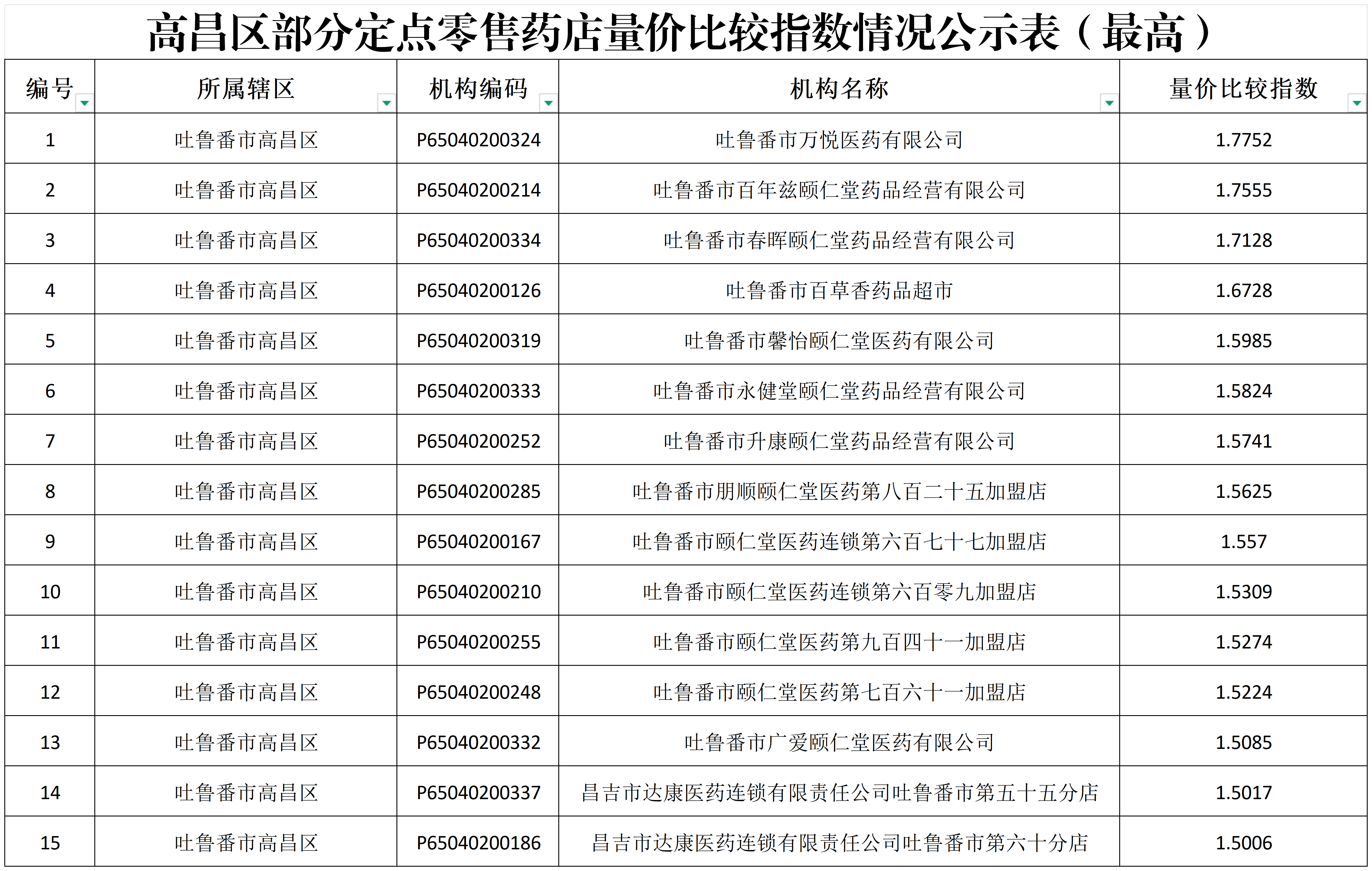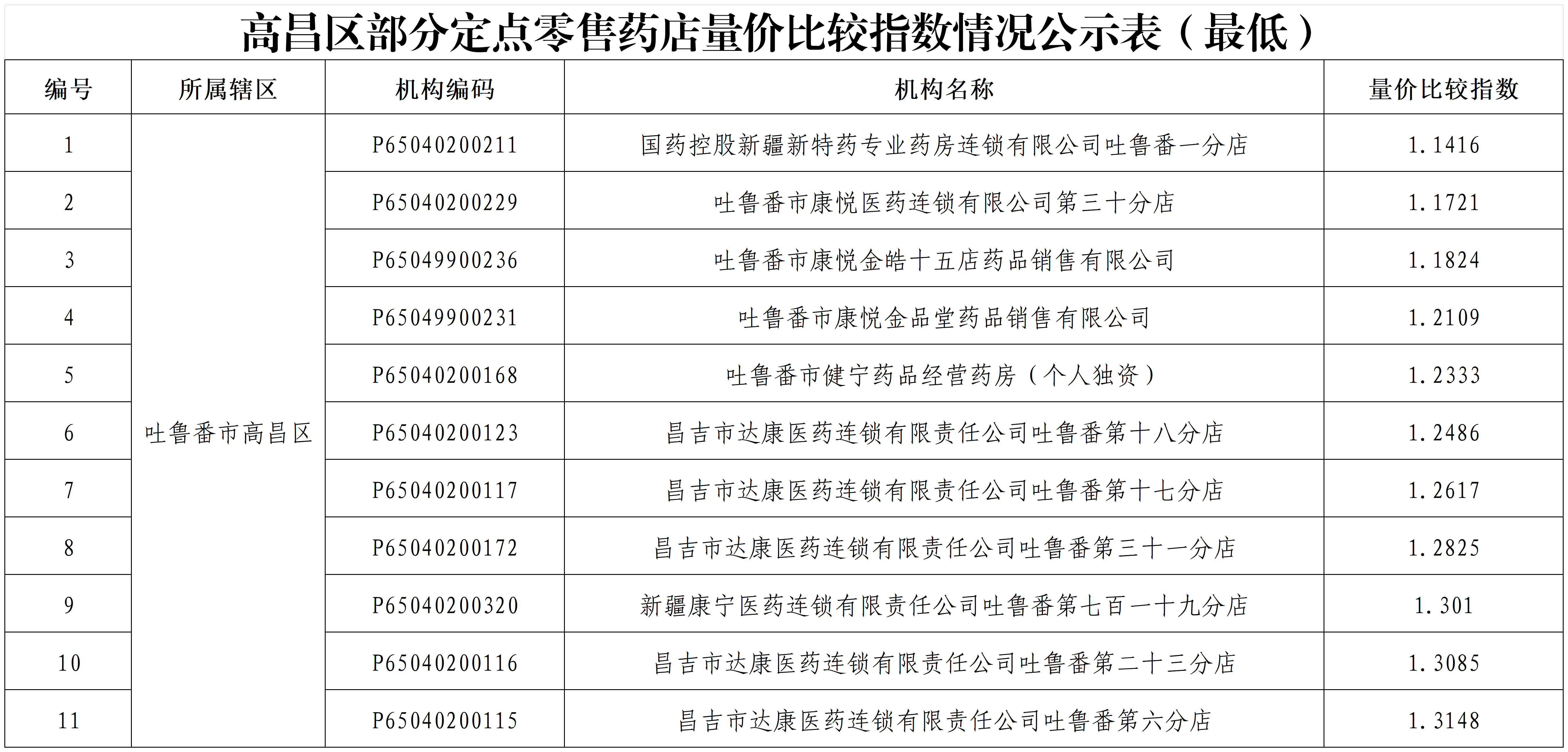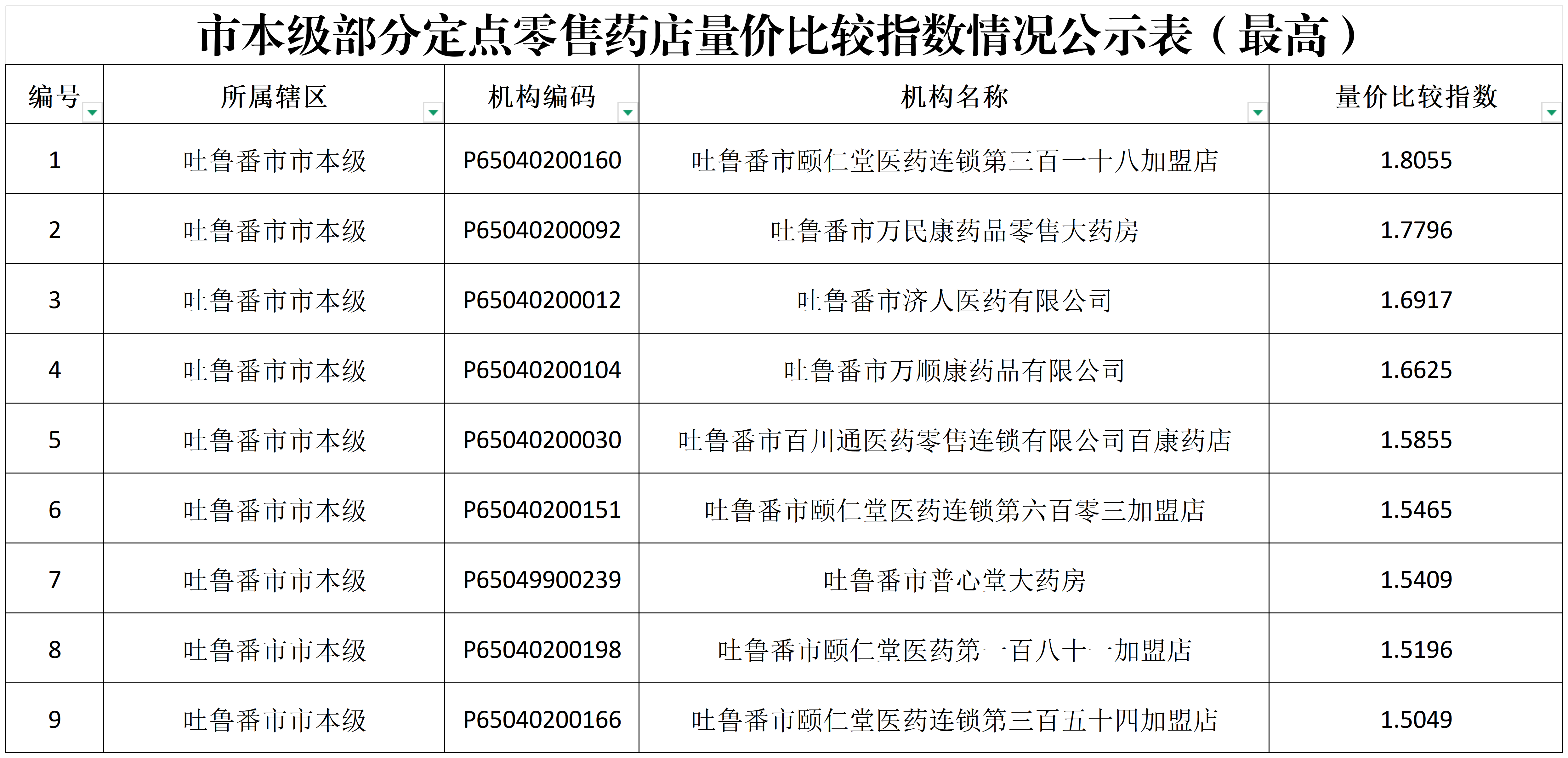 吐鲁番市2025年定点零售药店量价比较指数情况公示(第一批)