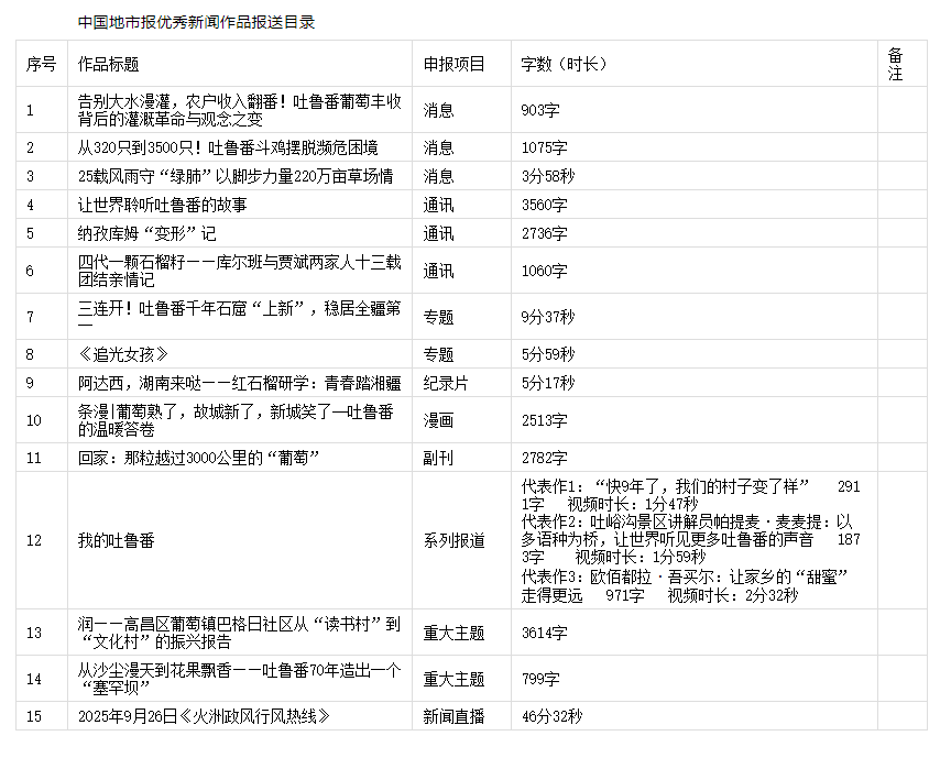 根据中国地市报研究会《2025年度优秀新闻作品征集》相关要求,吐鲁番市融媒体中心经严格审核,现拟推荐以下15件作品参加评选。现对拟参评作品进行公示,并接受社会监督。