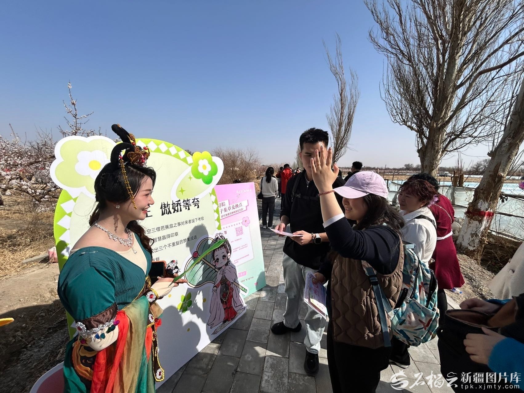 杏花季期间,共有128名志愿者“化身”四大名著人物、古代诗人、杏花仙子等,与游客对诗猜谜、斗歌斗舞,担任杏花节的氛围担当。来自乌鲁木齐市的大二学生夏年佳一路和“李白”对诗,和“孙悟空”猜谜,她笑着说:“本来只是想来看花,没想这么好玩,像参加了一场杏花林里的春日派对。”
